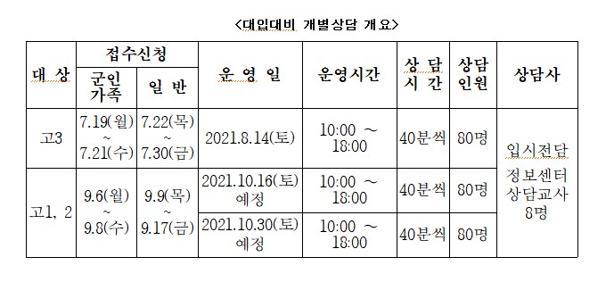 ※ 군인가족은 공군교육사령부에 별도 신청(우선 접수 받고자 하는 경우) - 장 소 :미래인재센터 강의실(진주시 청소년수련관 내) - 내 용 : 대입 수시전형대비 1:1 맞춤형 개별상담 - 참석대상 : 고등학생 및 학부모 - 상담비용 : 무료