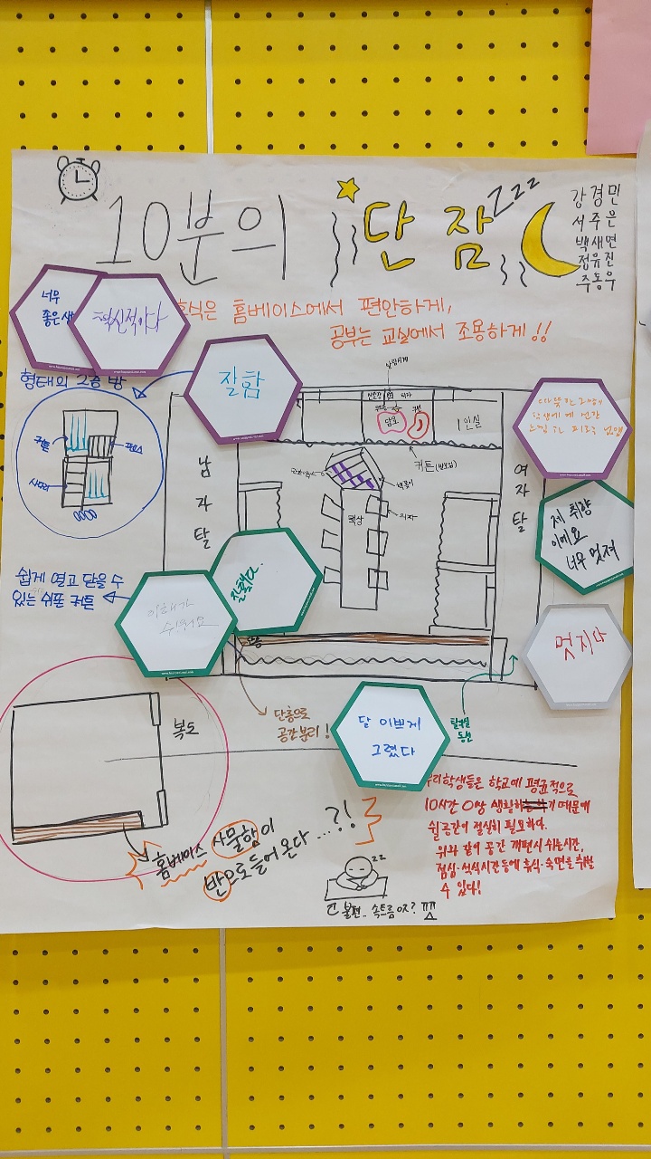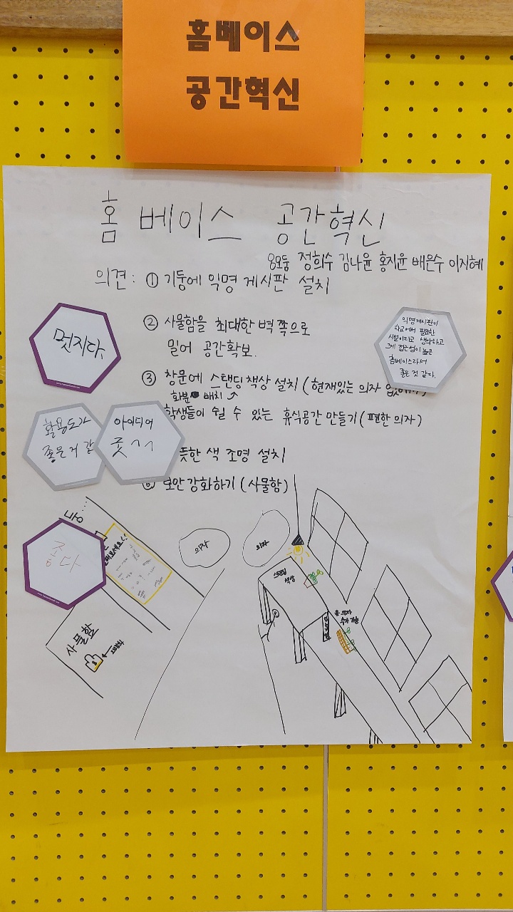 간부수련회 프로그램에 학교공간 둘러보기를 통해 학생 및 교직원 설문을 바탕으로 홈베이스와 1,2학년 학고제(정독실)를 집단지성을 통해 학생들의 의견을 수렴하는 시간을 가졌다~