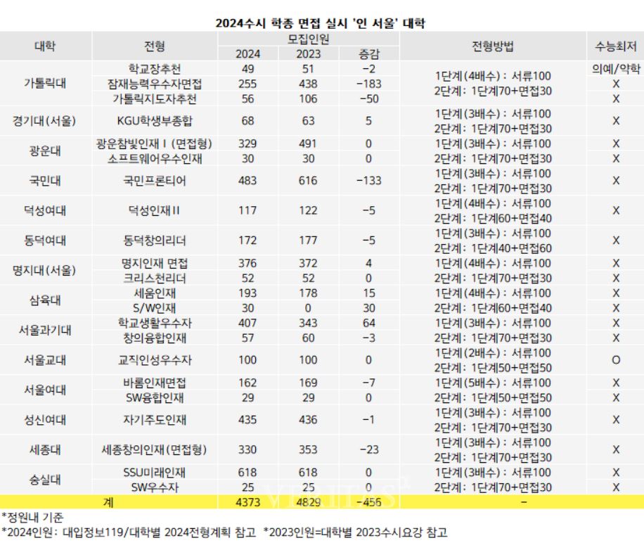 [2024수시] ‘인 서울’ 대학 학종 면접 어떻게 준비할까.. 14개교 22개 전형 4373명 ‘축소’ < 수시 상위대 < 수시 < 대입 < 기사본문 - 베리타스알파 (veritas-a.com)