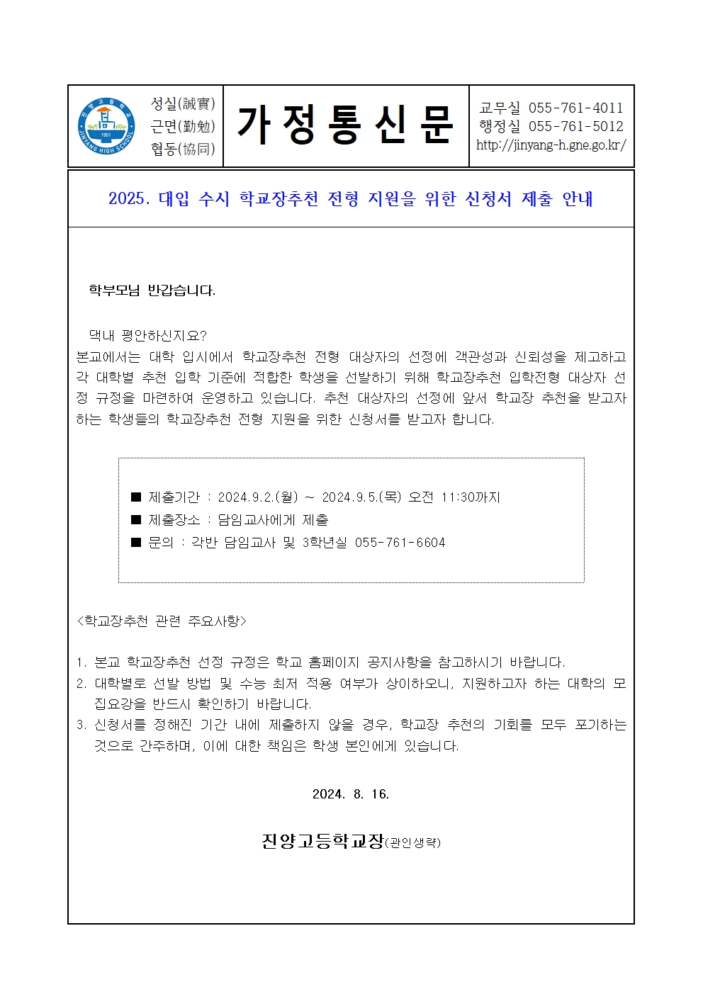 2025.대입 수시 학교장추천전형 지원하고자 하는 재학생은 기한 내에 담임선생님과 협의하시길 바랍니다.