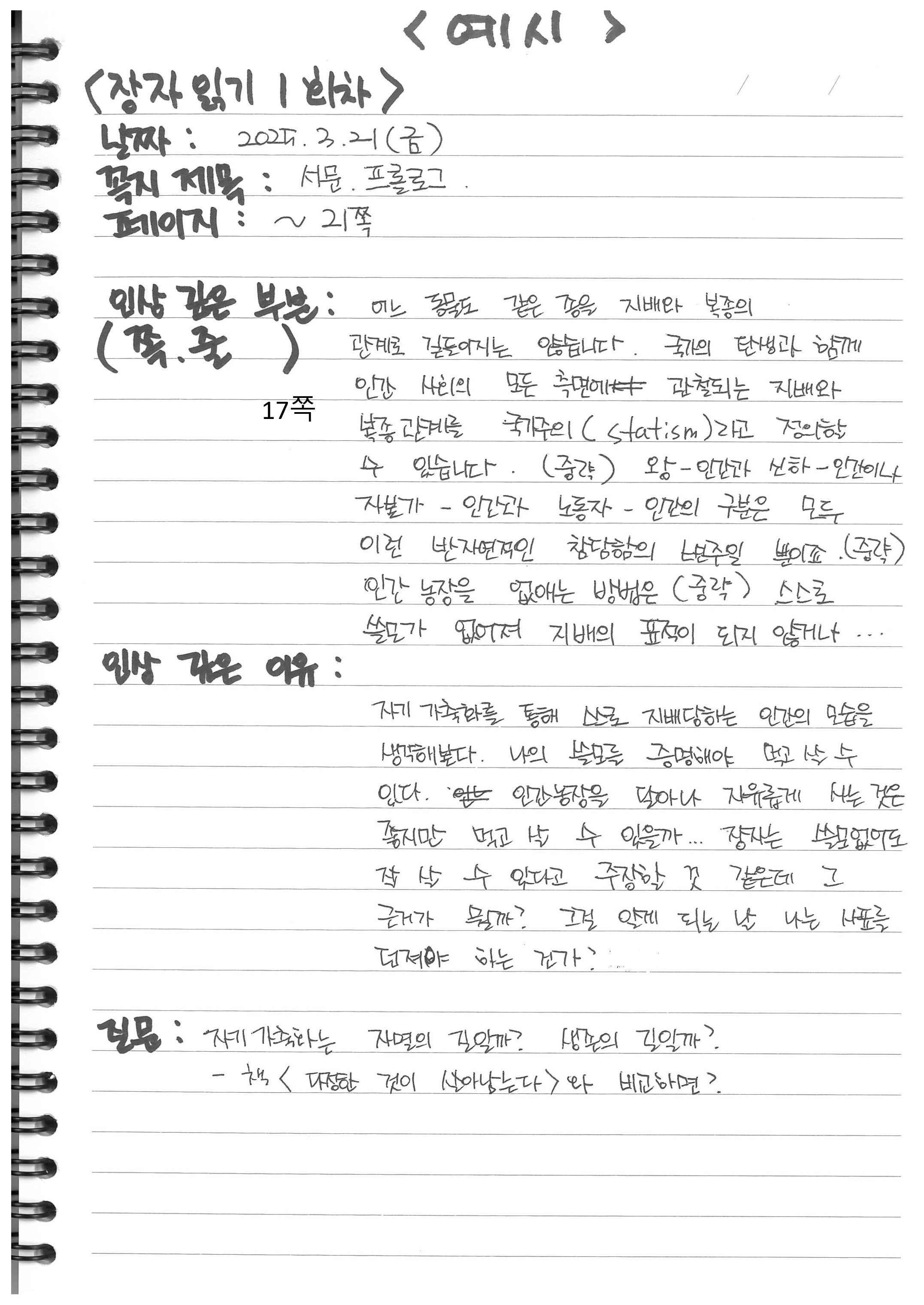 1. <강신주의 장자 수업>을 처음부터 21쪽까지 읽고 다음 예시와 같은 서식으로 소감문을 작성합니다.