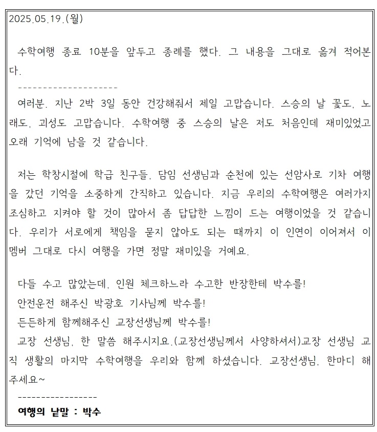 <예시2>'낱말'로 기록하는 나의 여행: 수학여행 중 남겨두고 싶은 자신의 경험이나 기분, 생각 등을 서술합니다. 글의 내용을 압축적으로 표현할 수 있는 '낱말'을 마지막에 적습니다.
