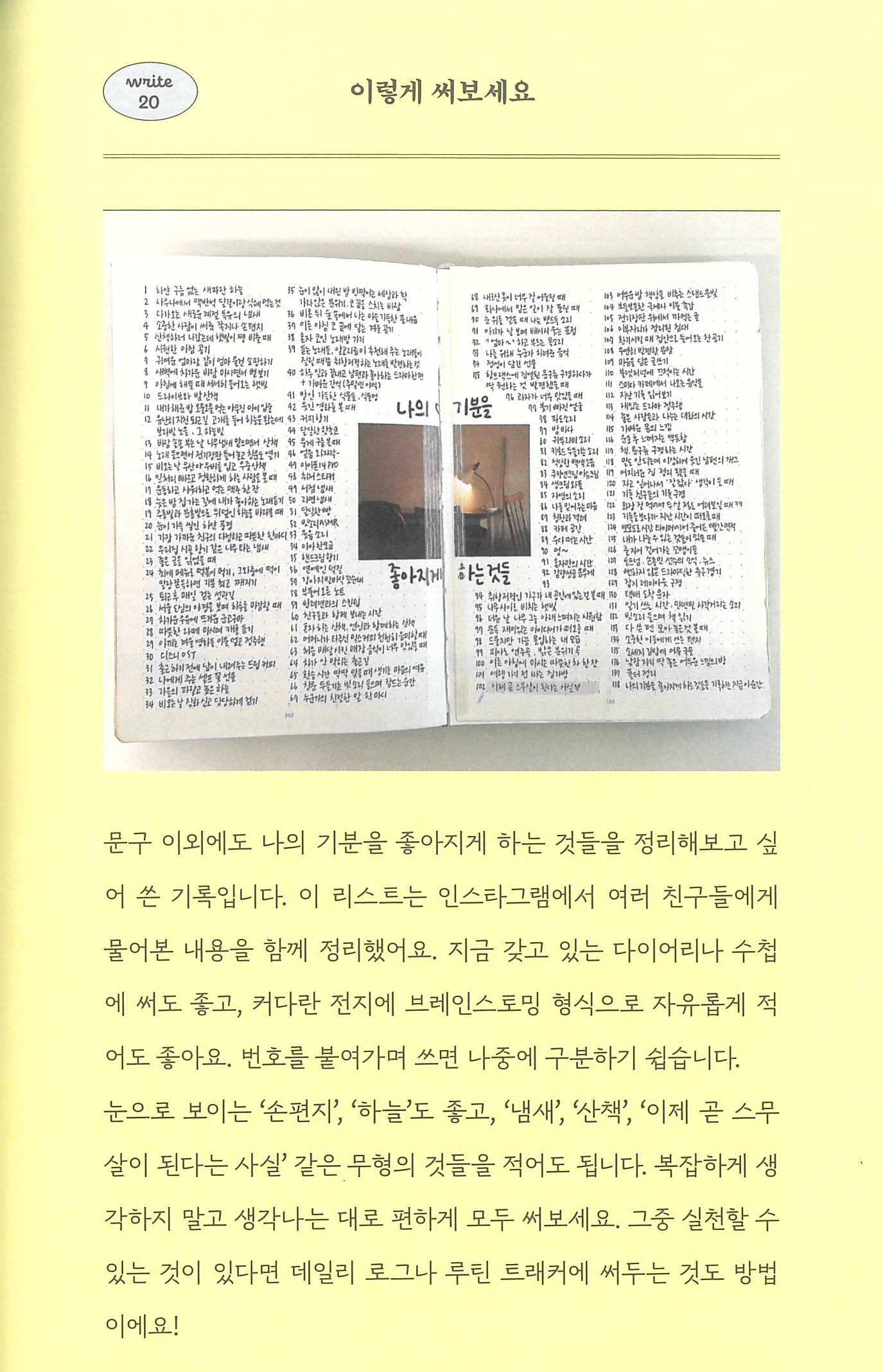 가. 필수 주제: 나를 기분 좋게 하는 것들 내 마음의 구멍을 메우고 나를 존중하는 기분이 들게 하는 것들을 쭉 적어 봅니다. 목록을 작성하면서 느낀 점을 3줄 이상 적습니다. <예시-기록이라는 세계(라니)179쪽>