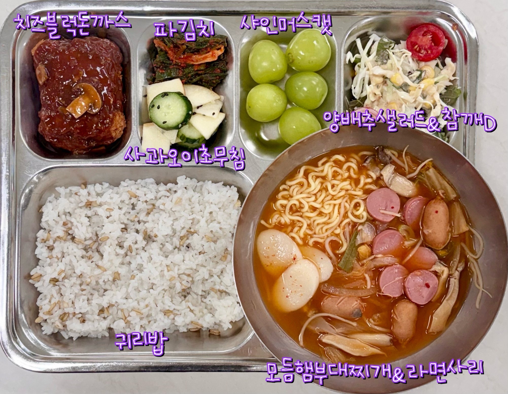 귀리밥 모듬햄부대찌개&라면사리 (1.2.5.6.9.10.12.15.16)양배추샐러드&참깨D (5.6.12.13)사과오이초무침 (13)치즈블럭돈까스 (1.2.5.6.10.12.13.16.18)자율:파김치 (9)샤인머스캣