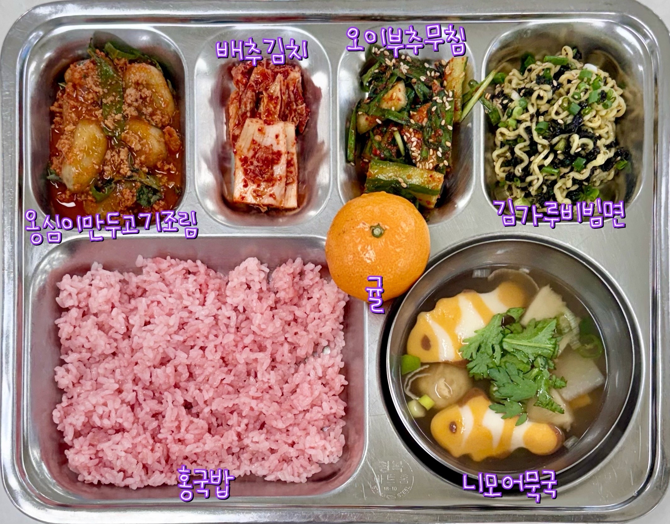 홍국밥 앵그리버드어묵국 (1.5.6) -> 니모어묵국으로 변경옹심이만두고기조림 (1.5.6.10.13.16.18)김가루비빔면 (1.2.5.6.10.13.15.16)