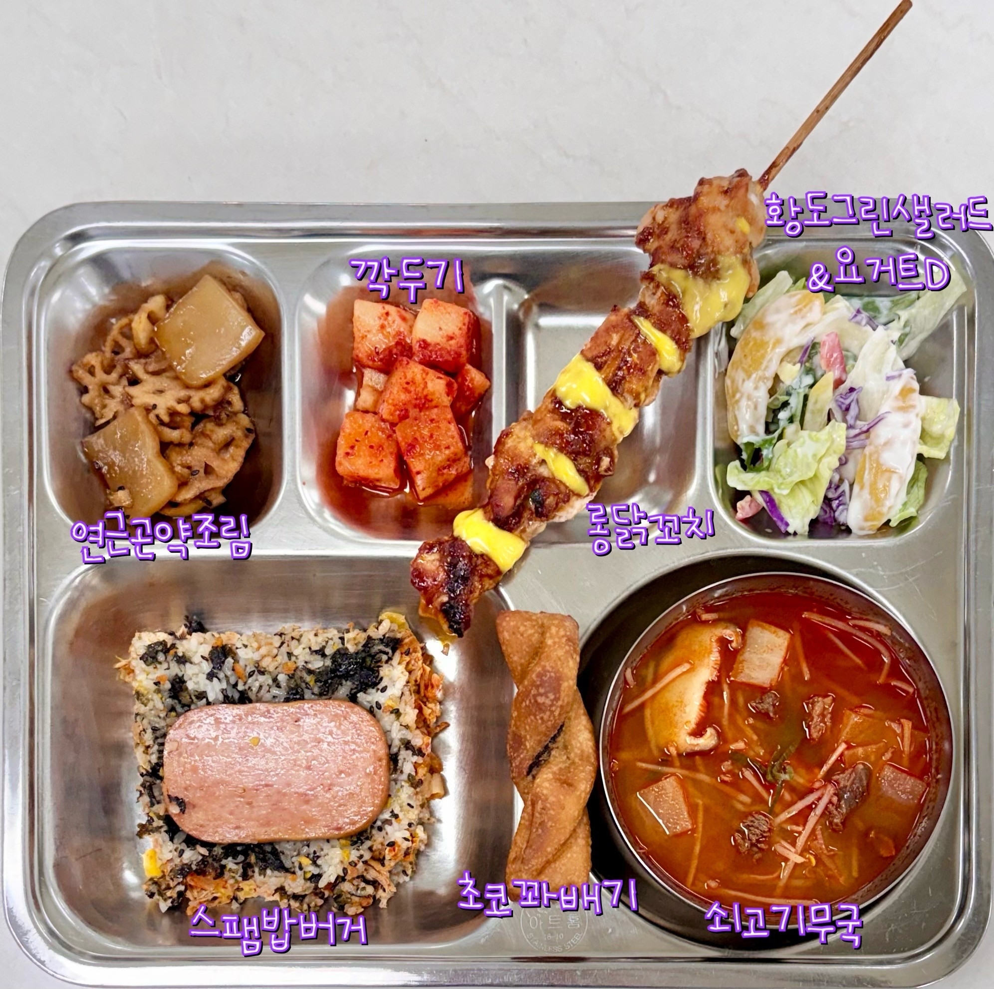 스팸밥버거 (1.2.5.6.9.10.13.15.16.18)쇠고기무국 (5.6.16)롱닭꼬치 (5.6.15)연근곤약조림 (5.6.13)
