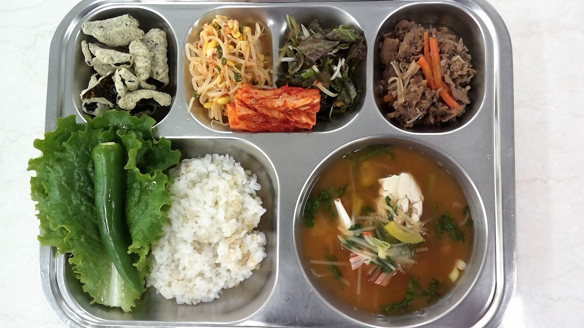 ㆍ찰보리밥ㆍ꽃게탕(5.6.8.9)ㆍ김부각ㆍ적상추파채겉절이(5.6.13.18)ㆍ콩나물무침(5.6.18)ㆍ숙성한우불고기(16)ㆍ배추김치(자율)(9)ㆍ우유(2)ㆍ상추쌈(자율)(5.6.13)
