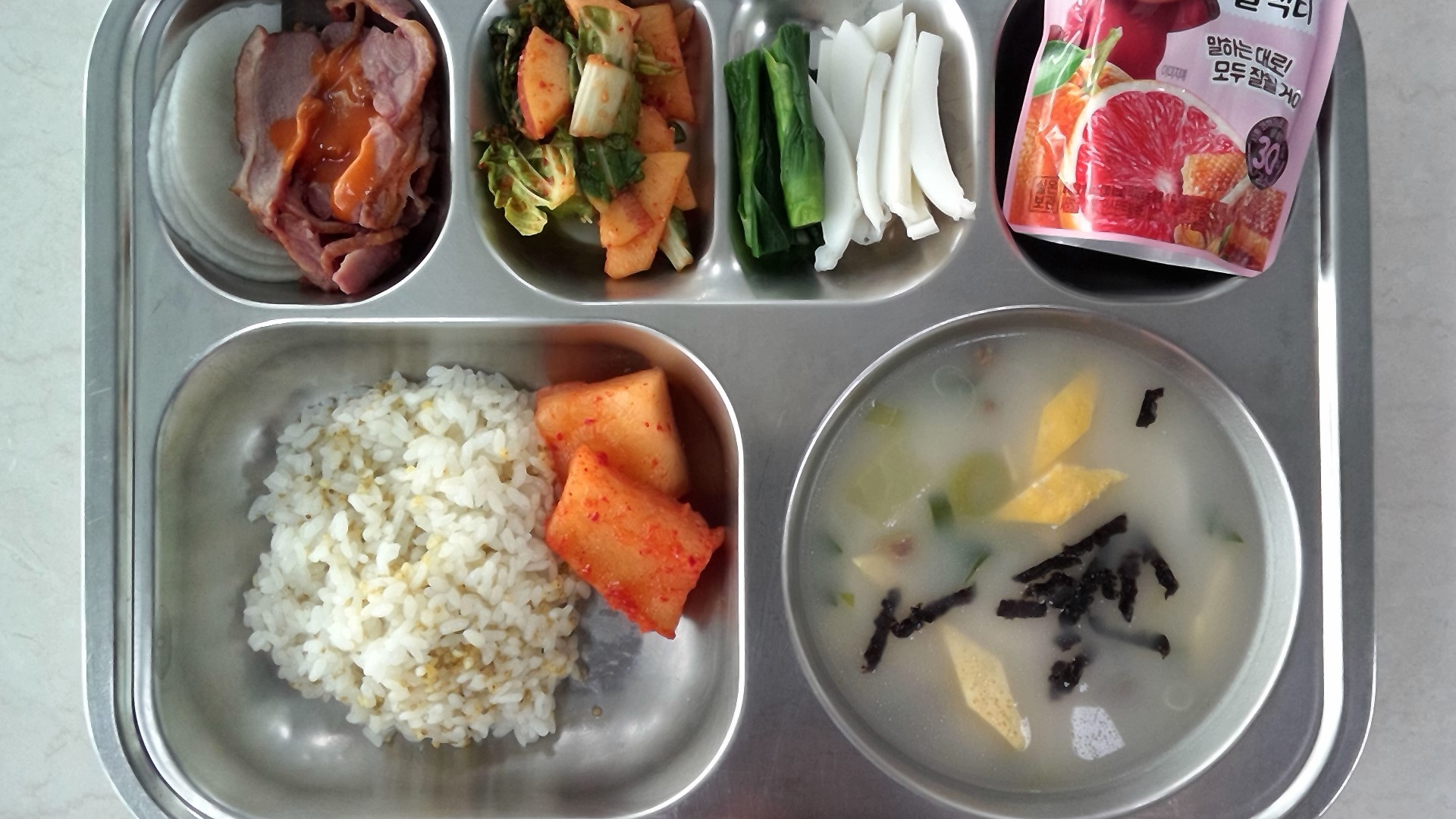 ㆍ차조기장밥ㆍ사골떡국(1.5.6.13.16.18)ㆍ친환경오리훈제/무쌈ㆍ단배추사과겉절이(5.6.13.18)ㆍ풋마늘갑오징어초무침(자율)(5.6.13.17)ㆍ섞박지(9)ㆍ우유(2)ㆍ자몽허니주스(13)