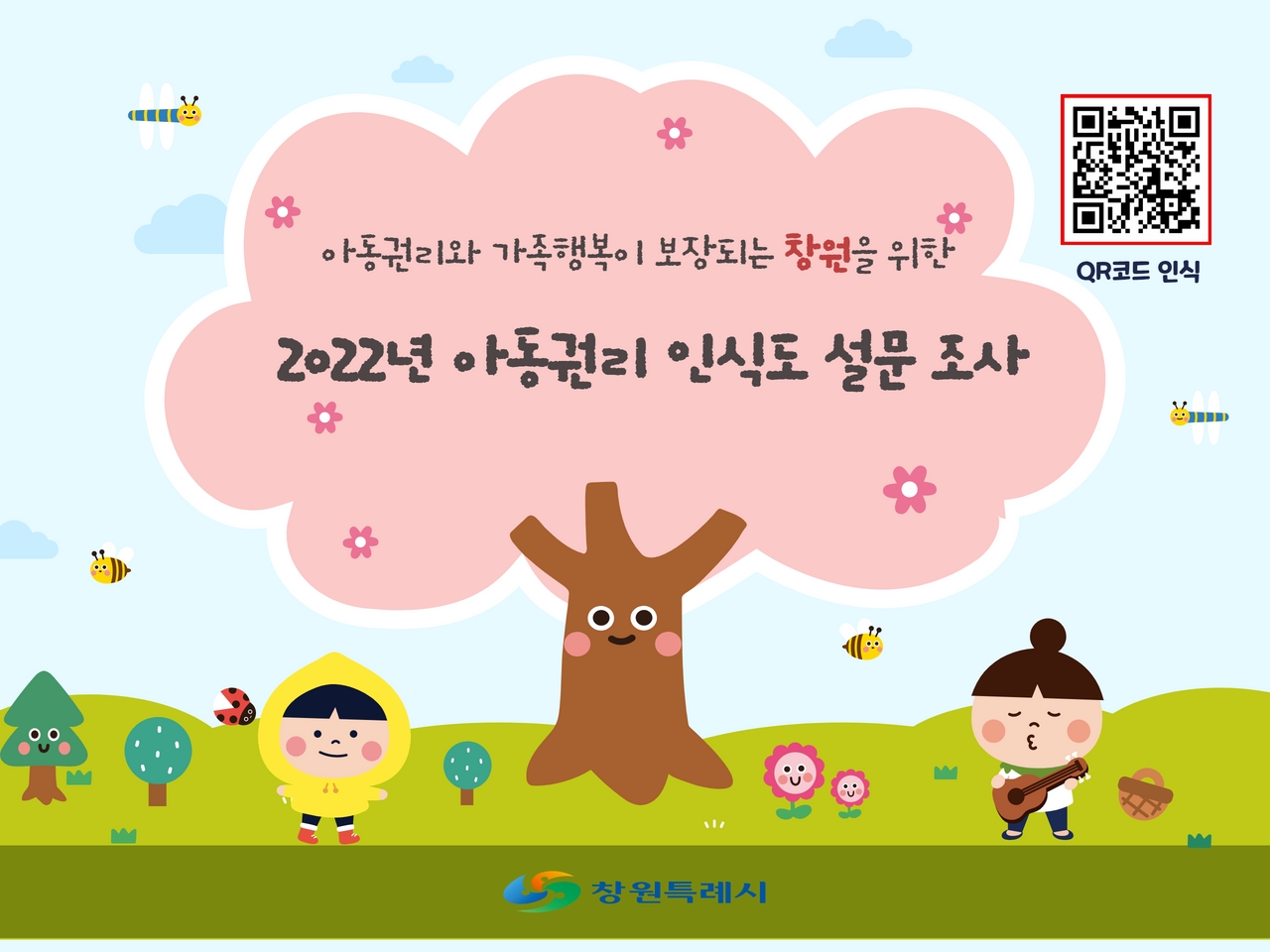 「2022년 아동권리 인식도 설문조사」 ○(기간)2022. 10. 19.(수) ~ 11. 18.(금)/ 1개월 간 ○(대상)창원시민 누구나 ○(방법)온라인 설문조사 (시 홈페이지 게시) ○(내용)17문항/아동권리 인지도 및 아동교육 수요 조사, 아동정책 건의 등