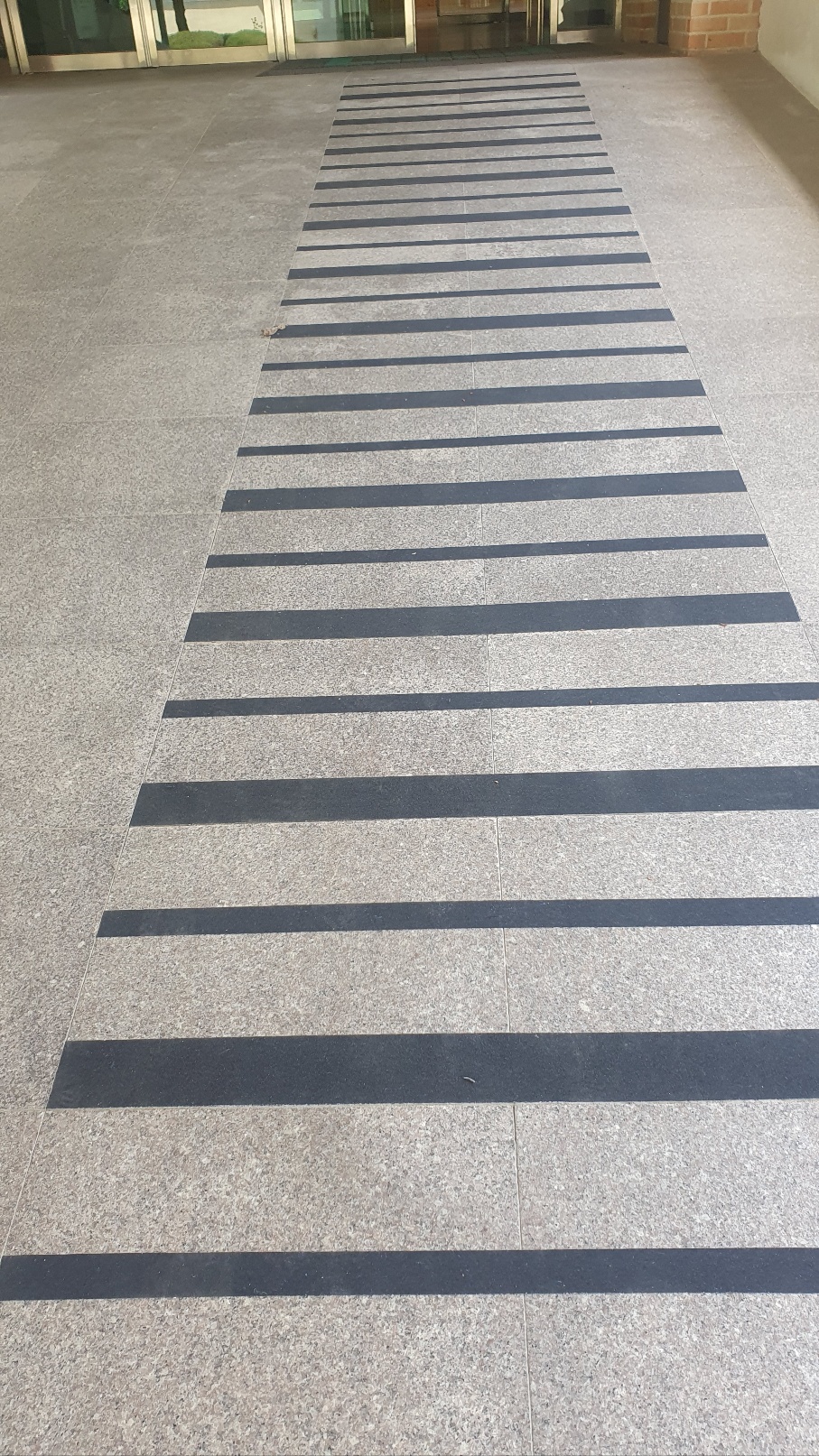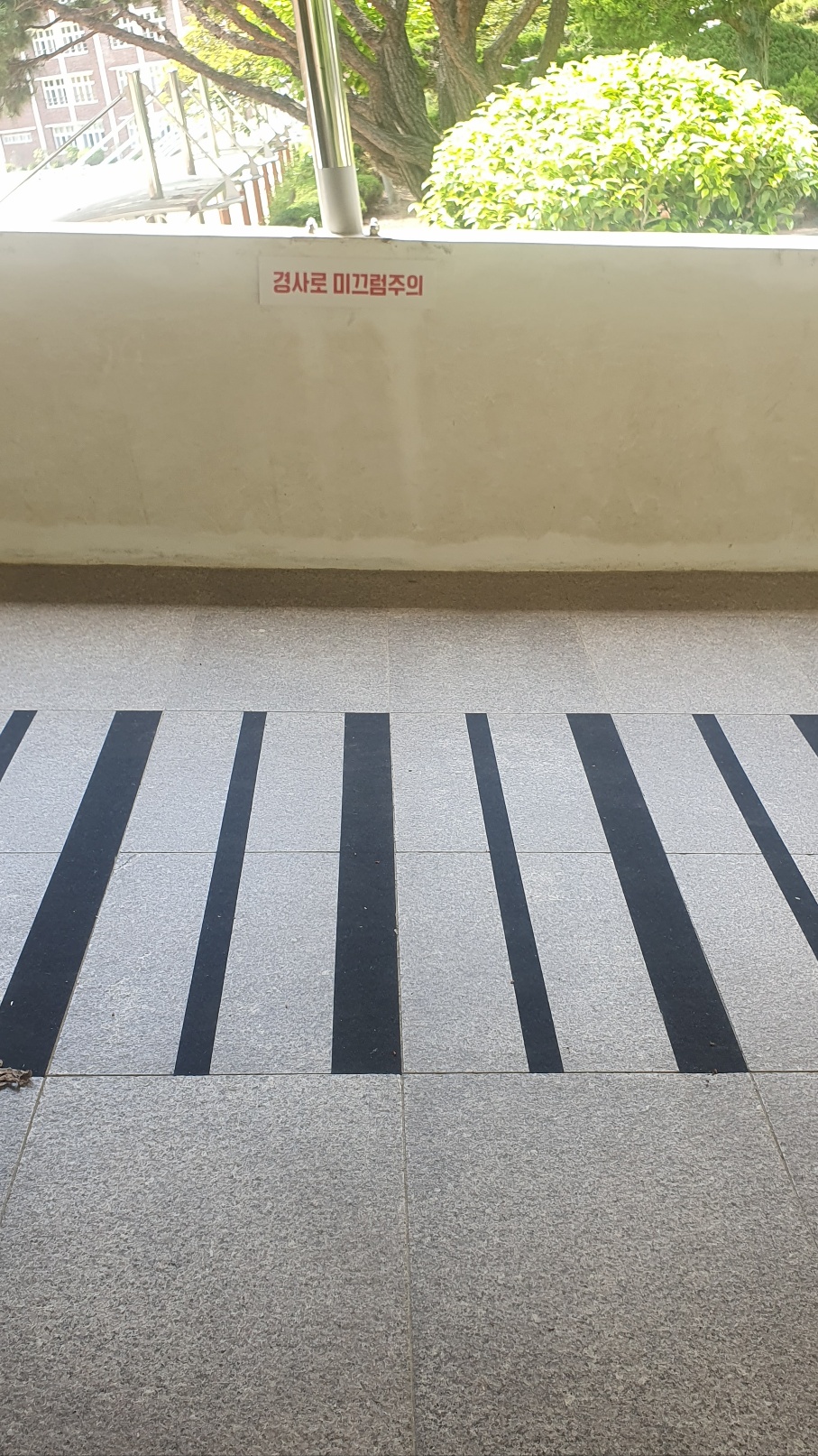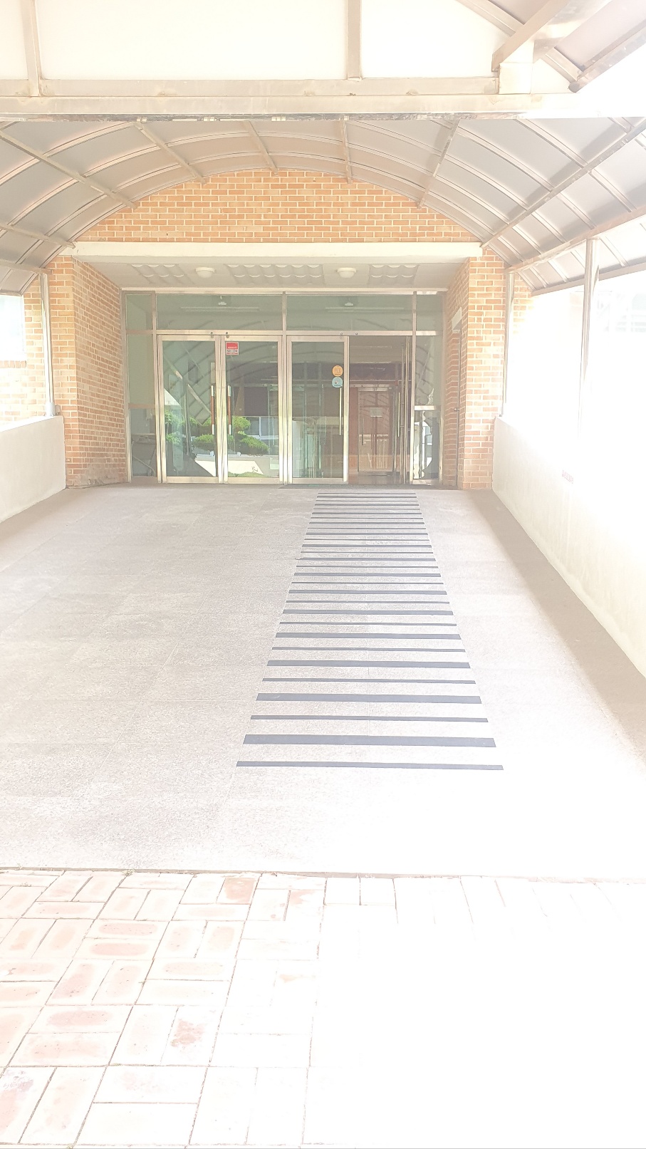 체육관입구 경사로에 미끄럼방지를 위한 논슬립테이프를 부착하여 학생들이 안전하게 통행하고 있습니다