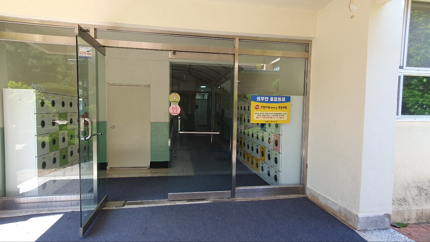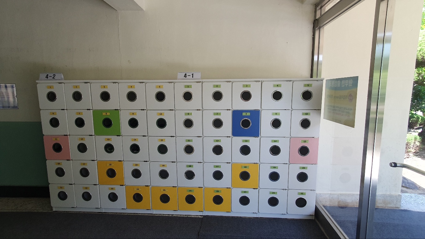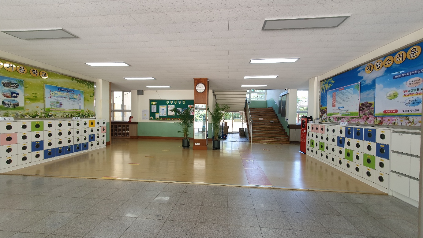 중앙출입구에 3,6학년 신발장, 동편출입구(체육관 앞쪽)에 4,5학년 신발장을 설치하였습니다.