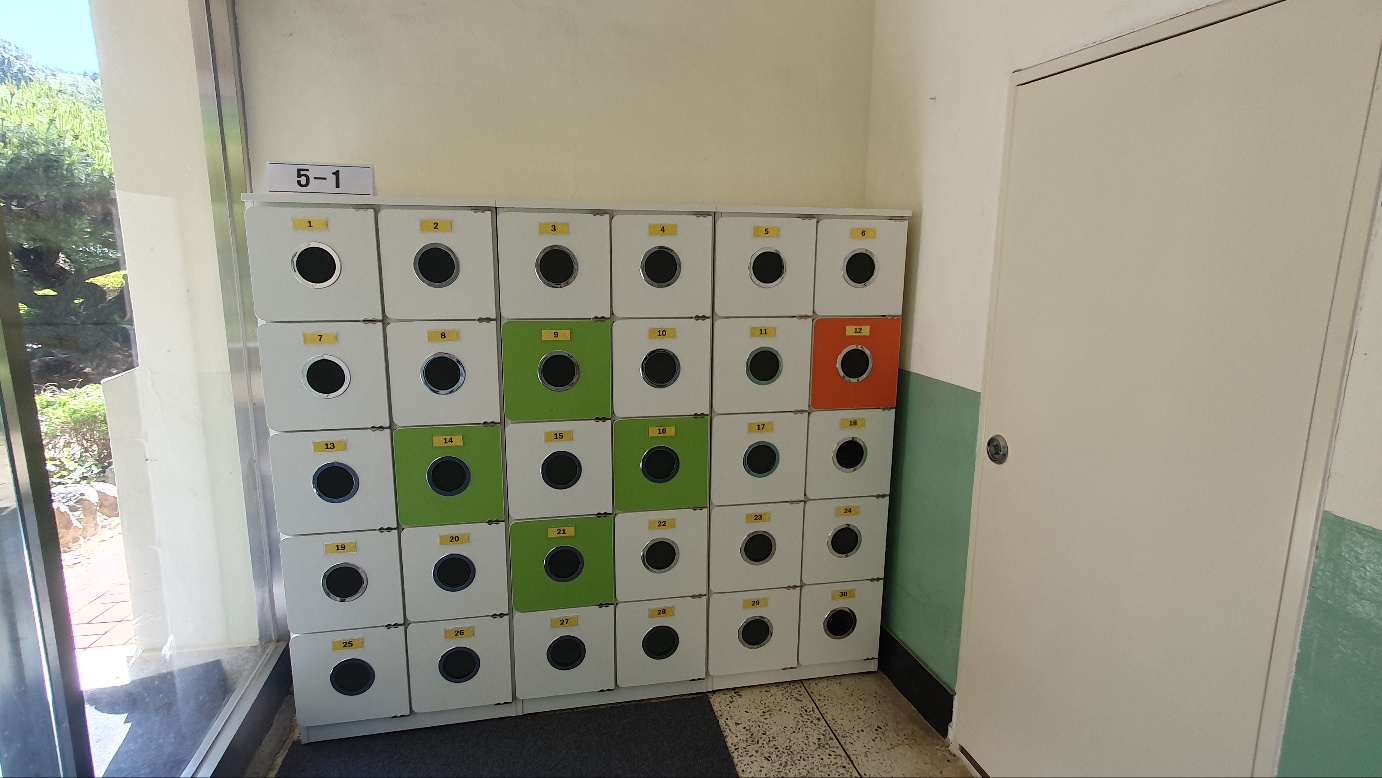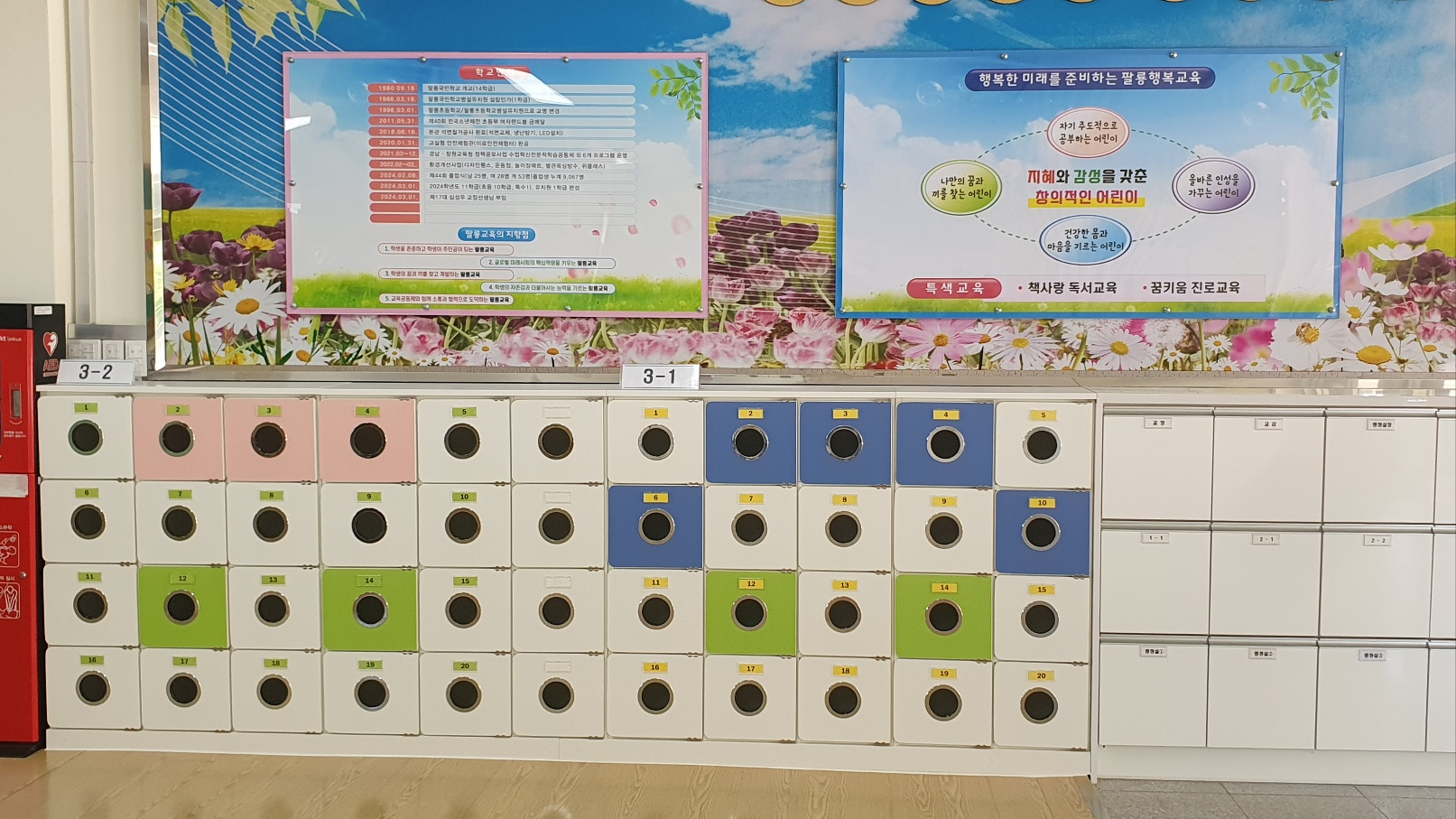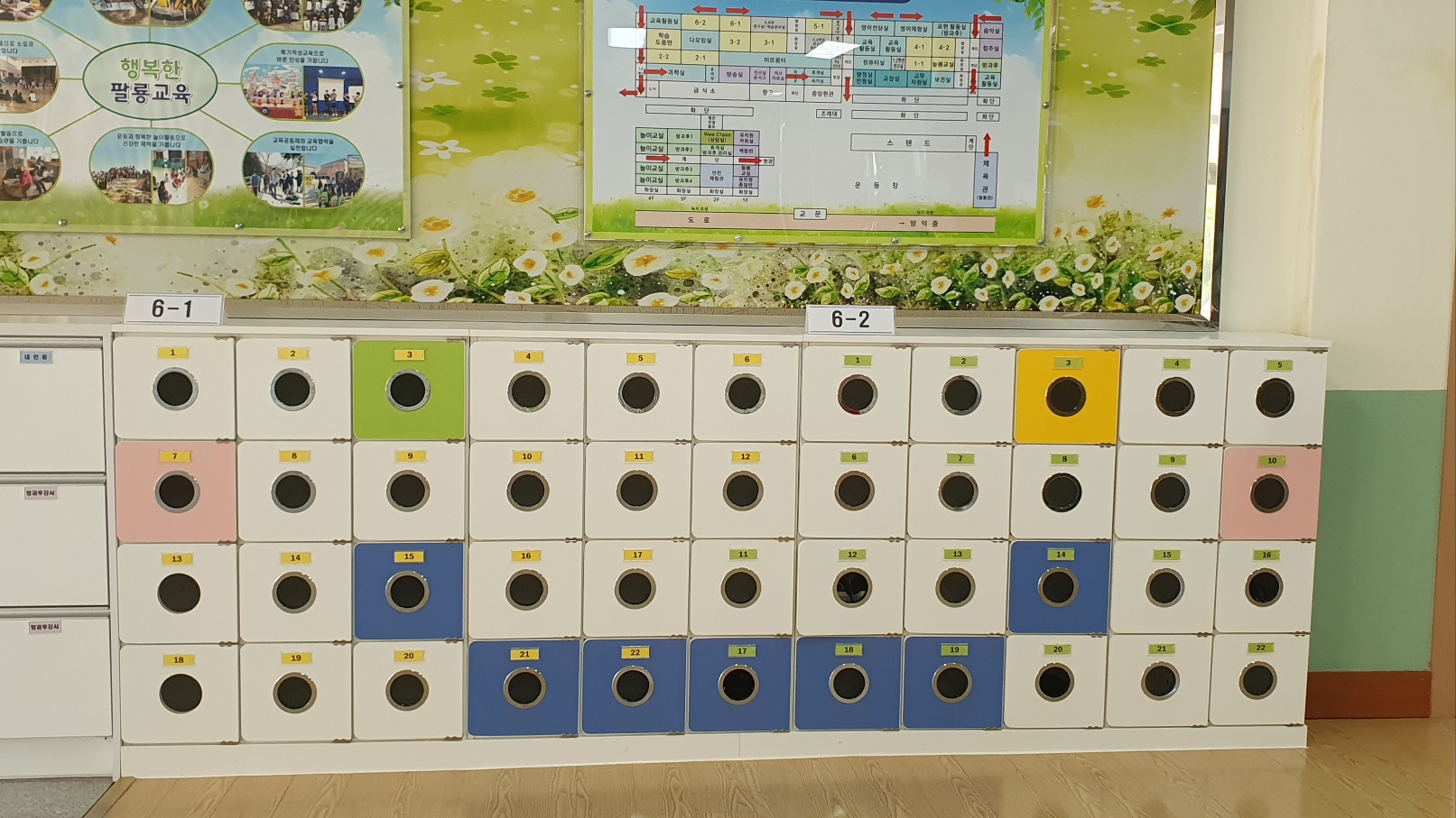 중앙출입구에 3,6학년 신발장, 동편출입구(체육관 앞쪽)에 4,5학년 신발장을 설치하였습니다.