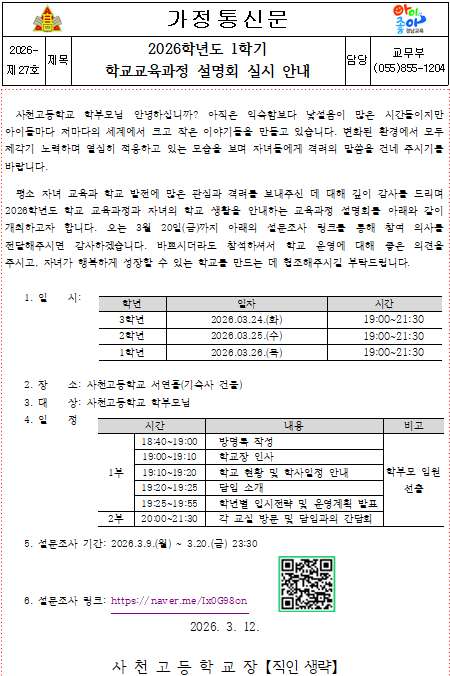 2026학년도 1학기 학교교육과정 설명회 실시 안내