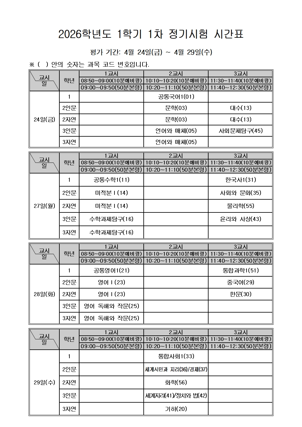 2026학년도 1학기 1차 정기시험 일정 및 관련사항 안내를 드립니다.