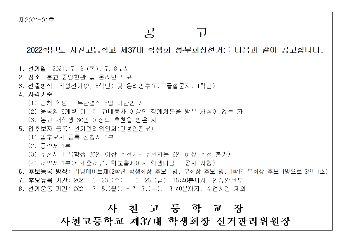 2022학년도 사천고등학교 제37대 학생회 정.부회장선거 입후보자 등록 서류