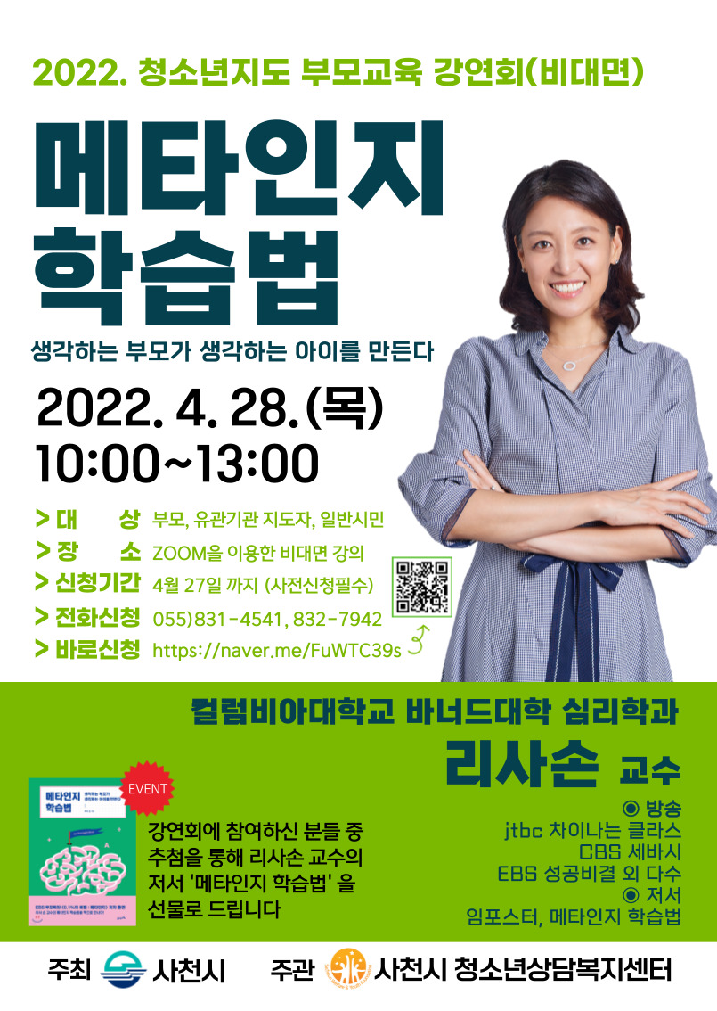<2022년 청소년지도 부모교육> 강연회(비대면) ▷일시: 2022년 4월 28일(화) 10시~13시 ▷내용: 메타인지학습법 ▷강사: 리사손 교수(컬펌비아대학교 바너드대학 심리학과) ▷장소: ZOOM을 이용한 비대면 강의 ☞ 신청해주신 연락처로 접속방법을 알려드립니다. ▷대상: 부모, 유관기관 지도자, 일반시민 ▷신청: 전화 또는 네이버 폼(http://naver.me/FuWTC39s) ▷문의: 831-4541, 832-7942
