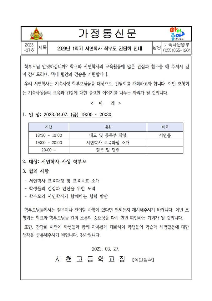 2023학년도 1학기 서연학사 학부모 간담회 안내