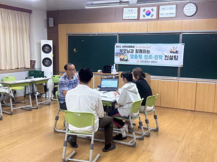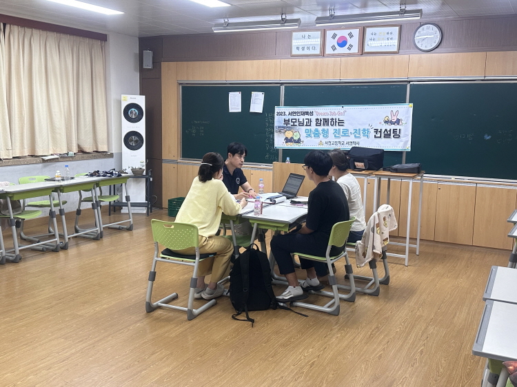 1. 행사명: 학생, 학부모와 함께하는 맞춤형 진로진학 컨설팅 2. 일시: 2023.07.05.(수) ~2023.07.07.(금) 18:00~22:00 3. 참가 대상: 서연학사 기숙사생 중 신청자, 48명 4. 활동 내용 가. 학생 3~4명 당 전문가 1인을 한 개 조로 편성. 나. 학생이 제출한 학교생활기록부, 모의고사 성적 등을 협의를 통해 분석, 앞으로의 계획을 수립 다. 학부모, 학생에게 학교생활기록부 진단 결과와 함께 진학에 대한 정보를 제공