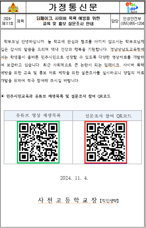 2025. 딥페이크, 사이버 폭력 예방 교육 등 자료 제작을 위한 설문조사 참여 요청 가정통신문