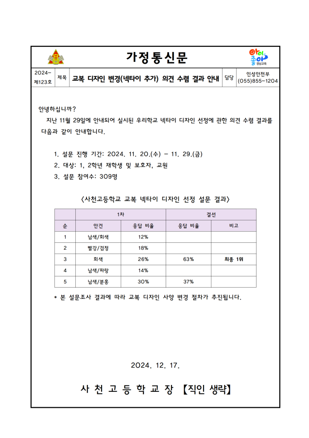2024. 인플루엔자 예방 및 관리 안내 가정통신문