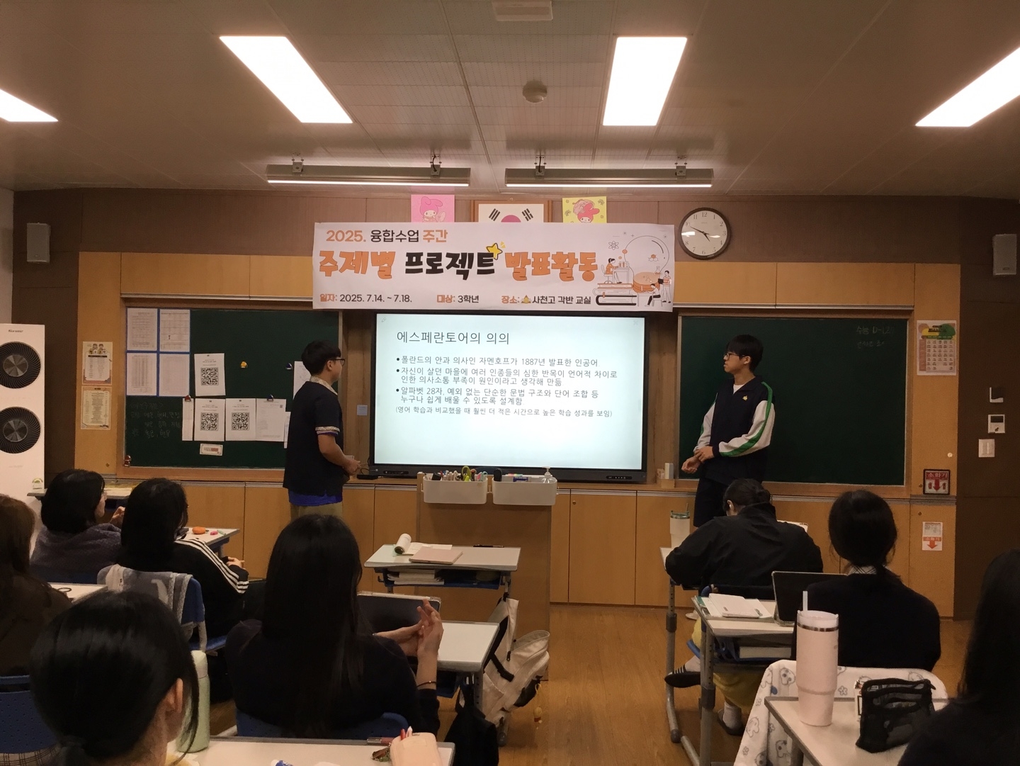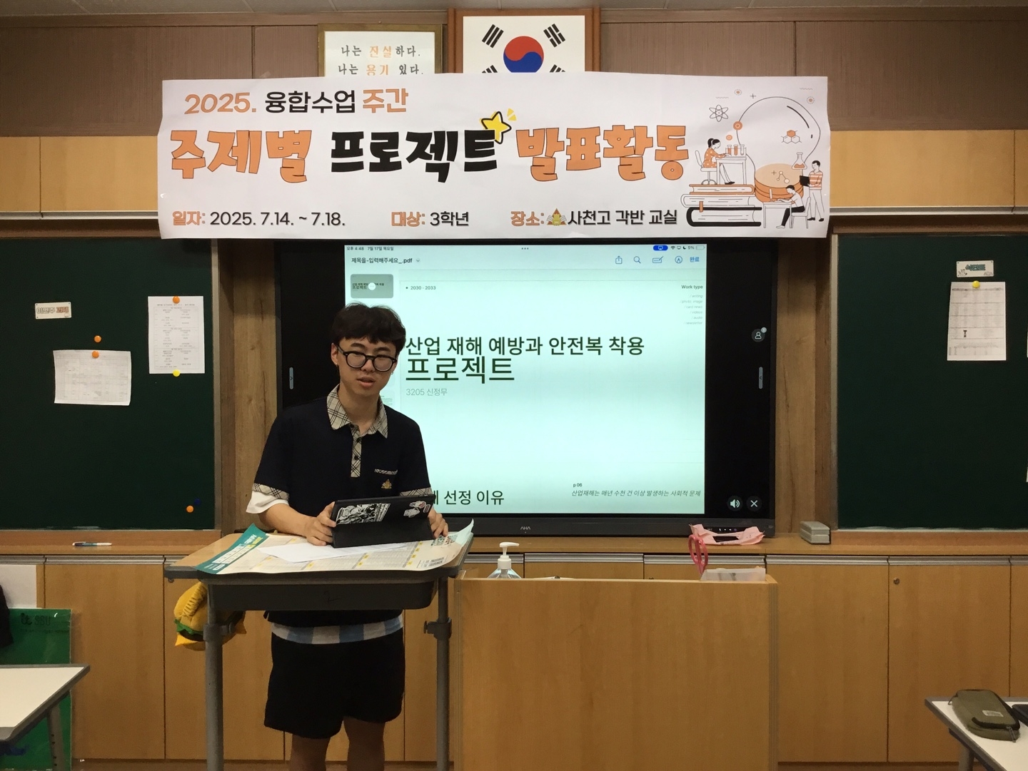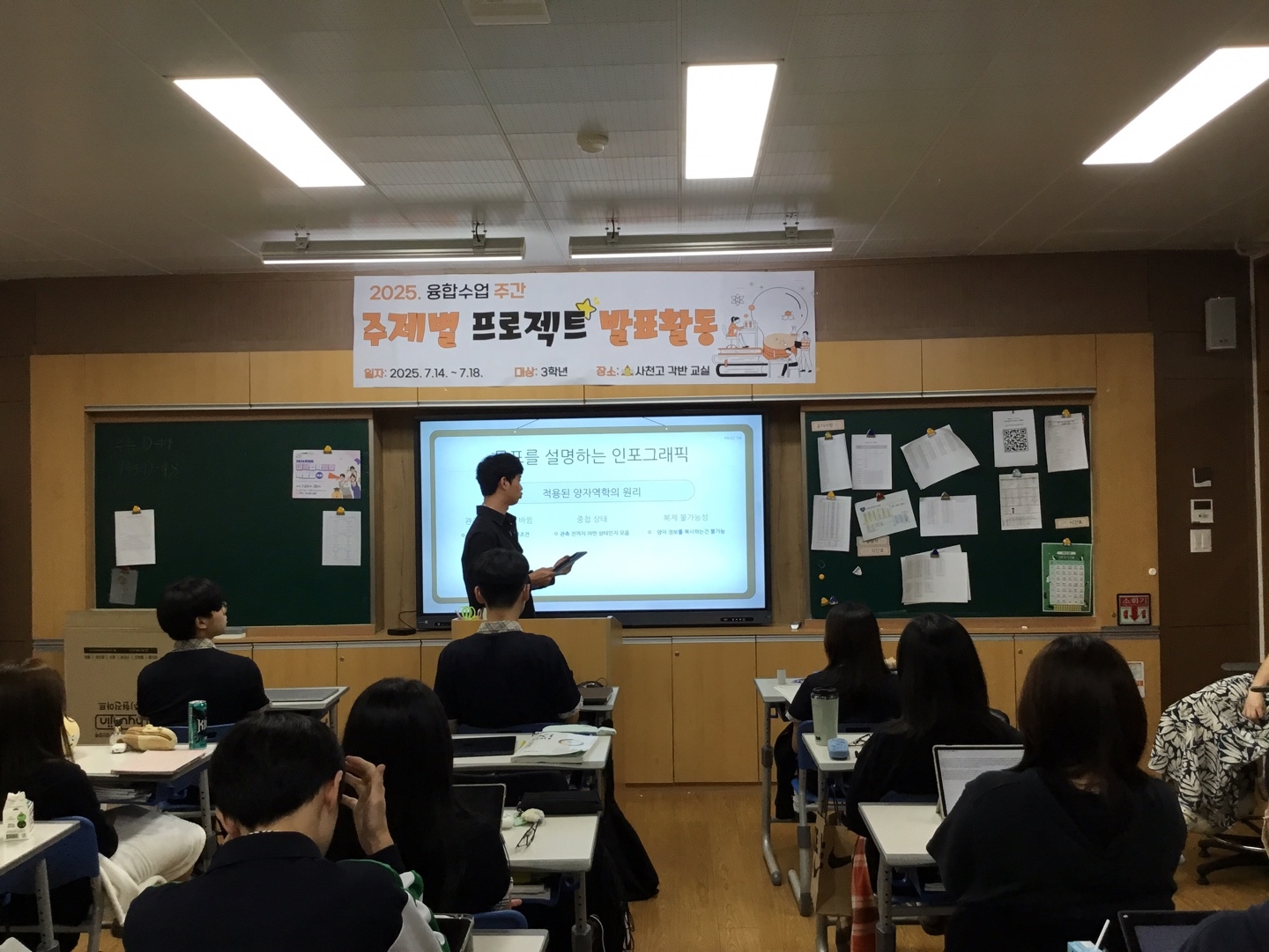주최: 3학년부 2025년 7월 17일(목), 사천고등학교 3학년 학생들은 각 반 교실 및 홈베이스에서 융합수업 프로젝트 활동을 성황리에 진행하였습니다. 이번 프로젝트는 학생들이 자율적으로 진로와 관련된 사회·실생활 주제를 탐색하고, 다양한 교과 지식을 융합하여 탐구하는 형태로 이루어졌습니다. ‘AI 딥페이크와 인간 신뢰’, ‘도시 열섬 현상 완화를 위한 친환경 포장재 개발’, ‘게임도 운동이다? - e스포츠 시대의 건강 교육’, ‘탄소배출권과 경제적 불평등’, ‘SNS 알고리즘과 소비 중독의 심리적 원리’ 등 총 100여 개의 주제가 모둠별로 발표되었으며, 학생들은 자신들의 관심사와 진로에 기반한 창의적인 결과물을 제작하여 공유하였습니다. 교사들은 학생들의 탐구 과정과 발표 내용을 관찰·평가하며, 진로 탐색의 깊이를 더해주었습니다. 또한 각 모둠의 활동 결과는 학교생활기록부에 반영되며, 캠페인 활동은 봉사활동 시간으로도 인정되었습니다. 이번 융합수업 프로젝트는 학생들의 진로 의식을 강화하고, 실생활 문제에 대한 탐구 능력을 기르는 소중한 시간이었습니다.