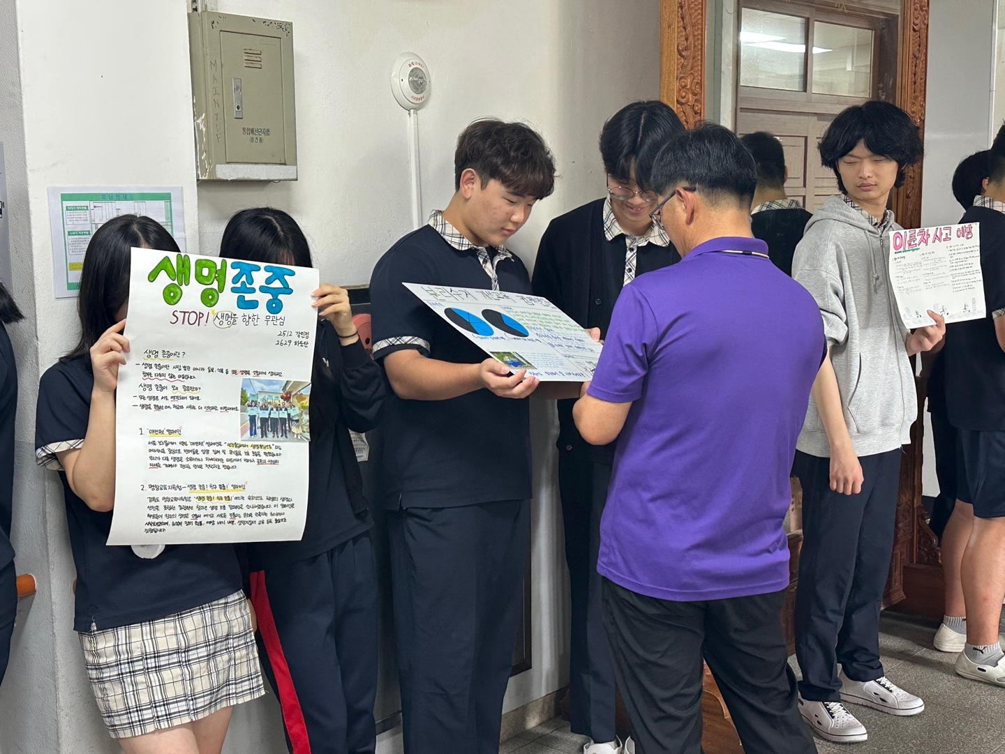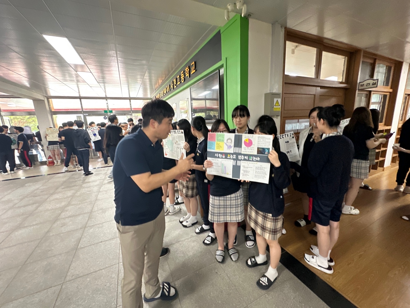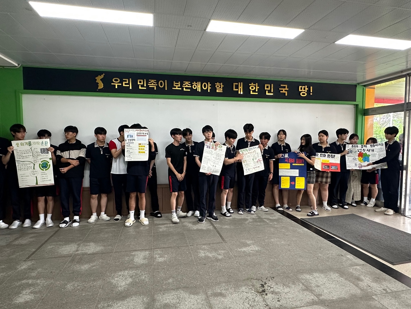 2025년 7월 18일(금), 사천고등학교 2학년 학생들이 공존과 상생을 주제로 지역·공동체 교육 캠페인 봉사활동을 펼쳤습니다. 학생들은 자체 탐구를 바탕으로 제작한 홍보 자료를 교내에 전시하고, 아침시간 및 점심시간을 활용해 교내 캠페인을 진행했습니다. 본 활동은 진로 및 사회 문제와 연계된 독서·탐구·실천 중심의 창의적 체험 활동으로, 학생들이 스스로 사회적 문제를 인식하고 해결 방안을 모색해보는 뜻깊은 교육 과정이었습니다. 이를 통해 공동체에 대한 책임감을 키우고, 올바른 민주 시민으로 성장하는 기반을 다지는 의미 있는 시간이 되었습니다.