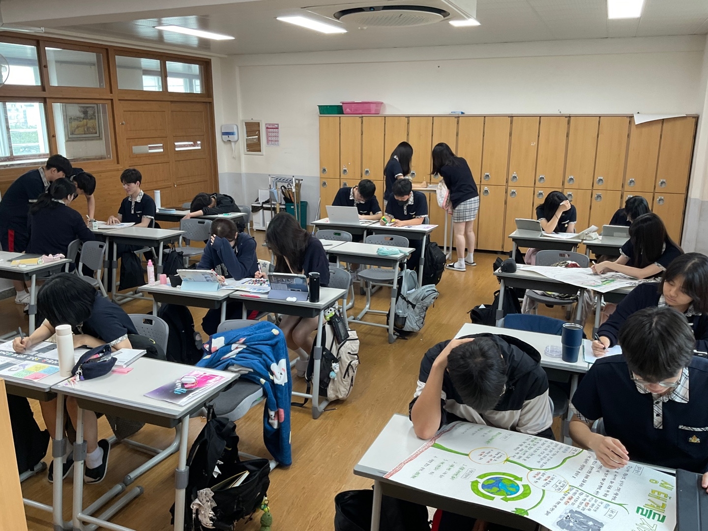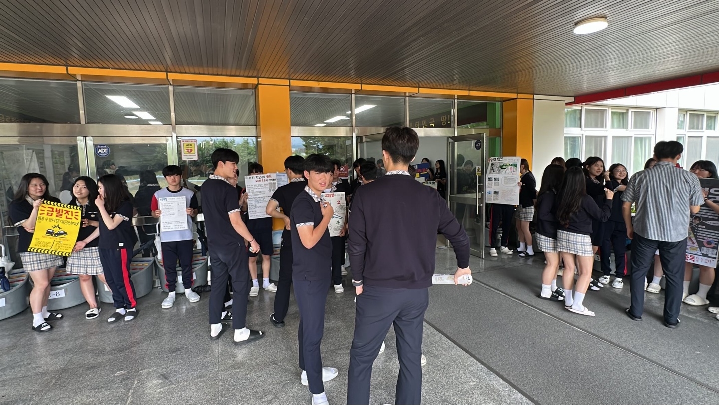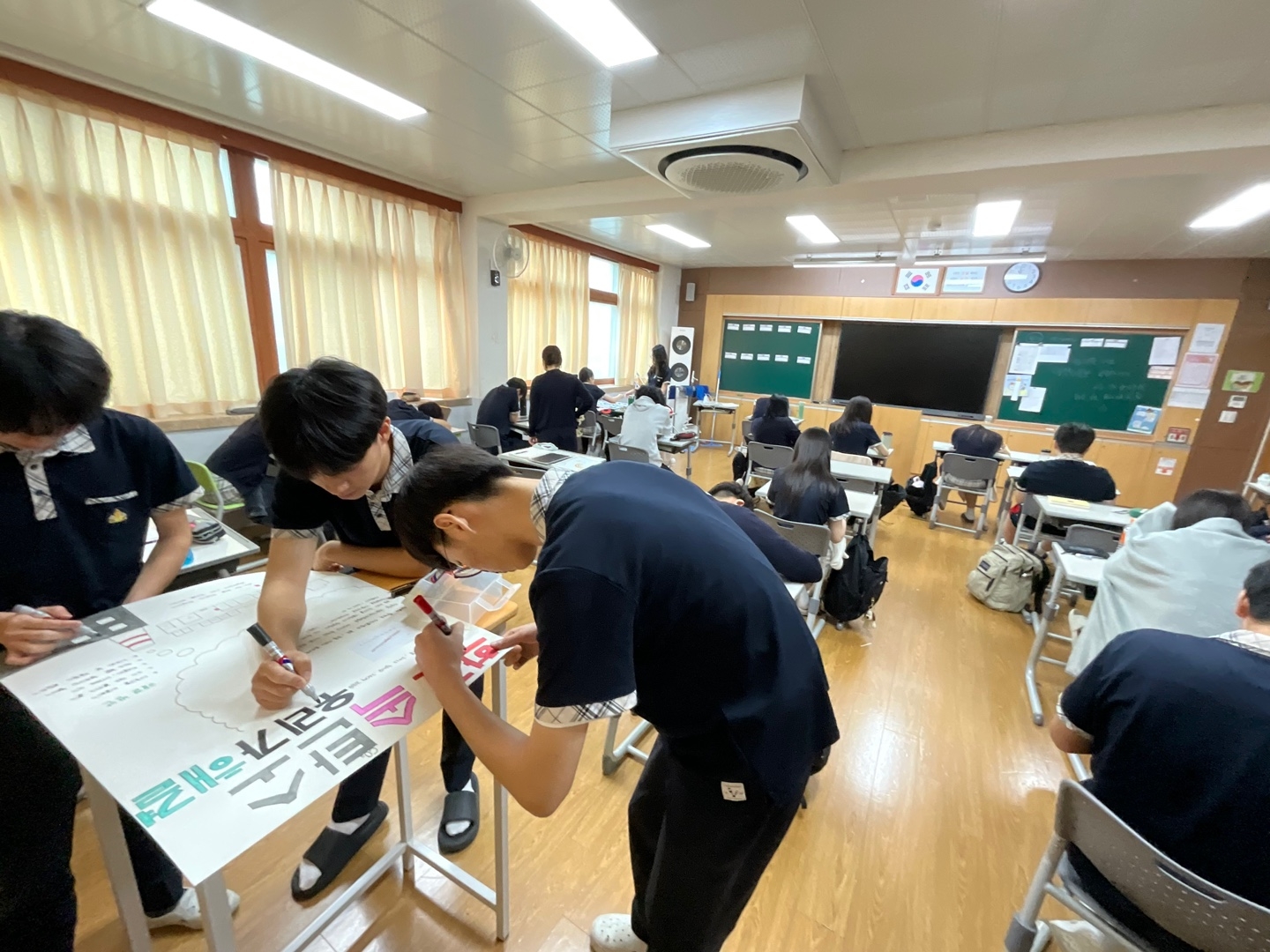2025년 7월 18일(금), 사천고등학교 2학년 학생들이 공존과 상생을 주제로 지역·공동체 교육 캠페인 봉사활동을 펼쳤습니다. 학생들은 자체 탐구를 바탕으로 제작한 홍보 자료를 교내에 전시하고, 아침시간 및 점심시간을 활용해 교내 캠페인을 진행했습니다. 본 활동은 진로 및 사회 문제와 연계된 독서·탐구·실천 중심의 창의적 체험 활동으로, 학생들이 스스로 사회적 문제를 인식하고 해결 방안을 모색해보는 뜻깊은 교육 과정이었습니다. 이를 통해 공동체에 대한 책임감을 키우고, 올바른 민주 시민으로 성장하는 기반을 다지는 의미 있는 시간이 되었습니다.