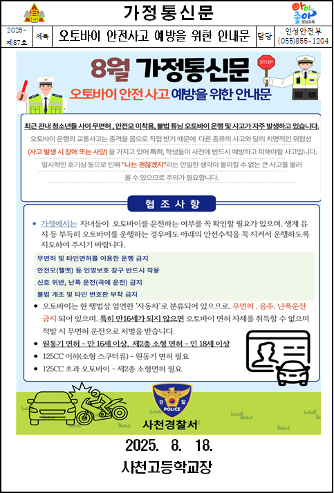 오토바이 안전사고 예방을 위한 안내 가정통신문