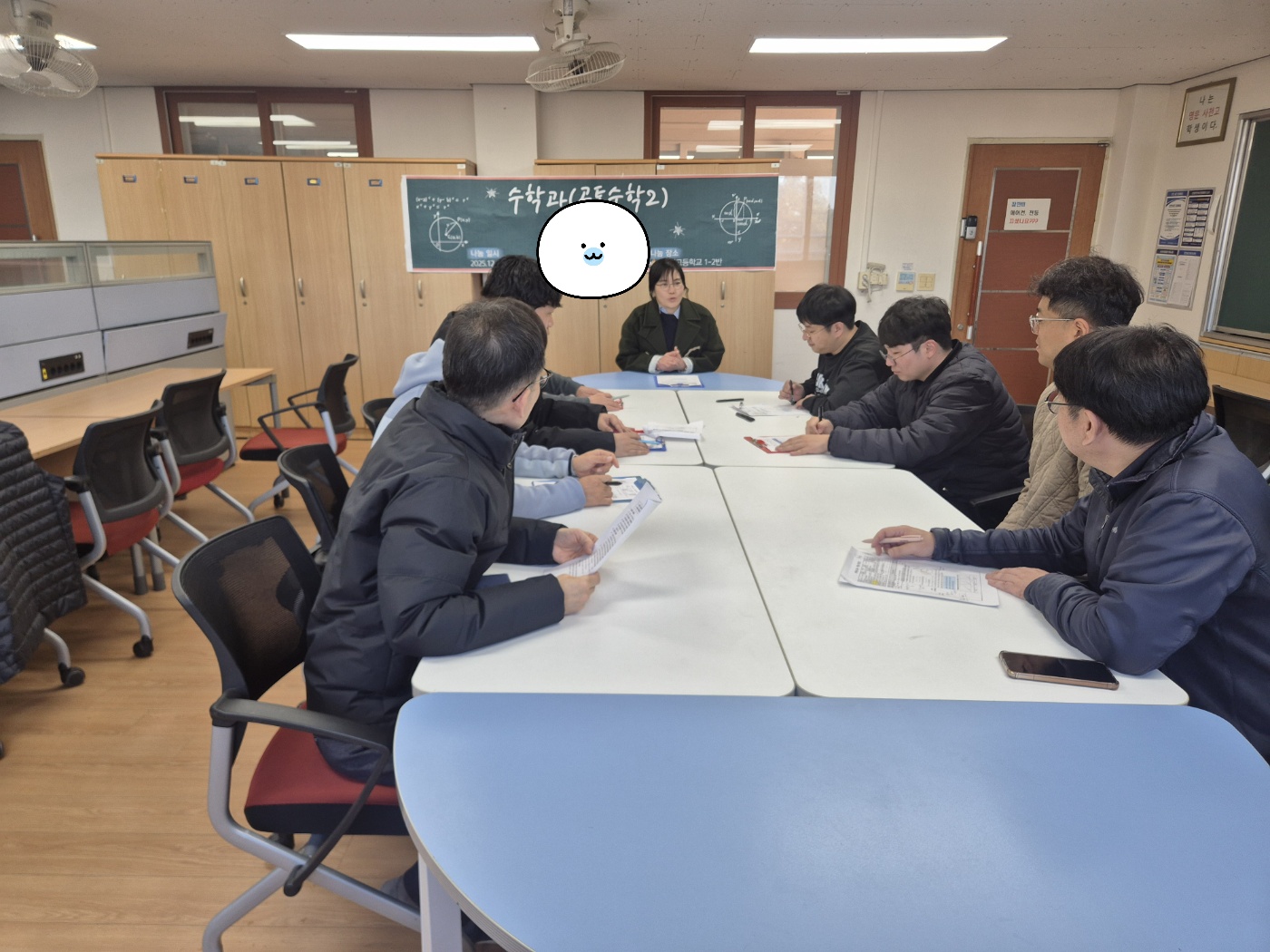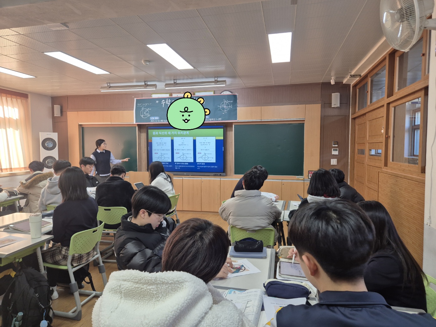 2025학년도 수학과 김** 선생님 공개 수업일시: 2025년 12월 18일 (1학년 2반, 6교시) 교과: 수학 중단원: 원의 방정식 소단원 주제: 원과 직선의 위치 관계 수업 형태: 모둠별 협력 학습 및 발표 학습 목표: 원의 방정식과 직선의 방정식을 활용하여 위치 관계를 이해하고, 두 가지 판별 방법을 적용하여 문제를 해결할 수 있다. 주요 활동: · 이차방정식의 해의 개수를 이용한 원과 직선의 위치 관계 탐구 · 원의 중심과 직선 사이의 거리를 활용한 판별 방법 비교 · 지오지브라 그래픽 계산기를 활용한 위치 관계 시각화 활동 · 칸딘스키 작품을 모티브로 한 수학·예술 융합 탐구 및 발표 정리 활동: 수업 내용 정리 및 모둠별 발표 피드백 차시 예고: 원과 직선의 위치 관계를 활용한 문제 해결