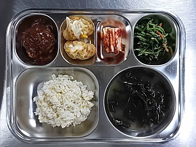 기장밥 대합미역국 (5.6.18)겨울초나물 (5.6)정통함박스테이크 (1.2.5.6.10.12.13.16.18)해쉬브라운콘치즈 (1.2.5.6.13)배추김치(자율) (9)우유 (2)