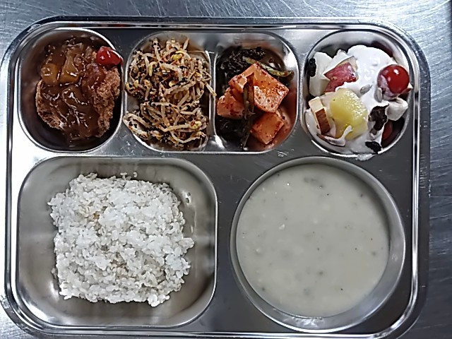 보리밥 양송이스프 (2.5.6.13.16)과일샐러드 (2.12.13)매콤콩나물무침 (5.6)통안심돈가스*소스 (1.2.5.6.10.11.12.13.16.18)총각김치(자율) (9)우유 (2)