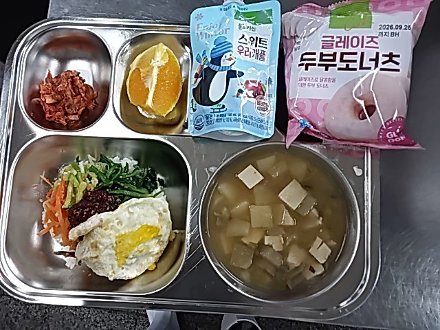 비빔밥 (5.6.13.16)맑은장국 (5.6)달걀후라이 (1.5)배추김치(자율) (9)오렌지 우유 (2)통콘 피자 (2.5.6)