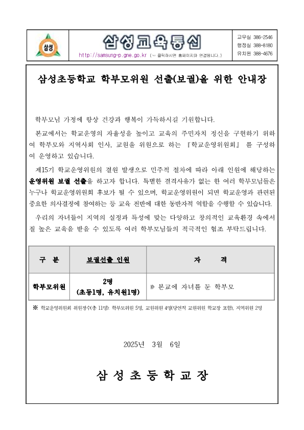 많은 학부모님의 관심을 바라며 차후 입후보 등록 등은 홈페이지를 통하여 계속 안내드리겠습니다.