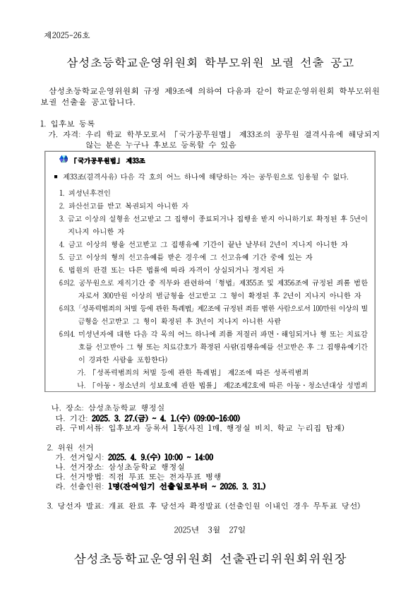 제15기 삼성초등학교운영위원회 학부모위원 보궐 선출 공고