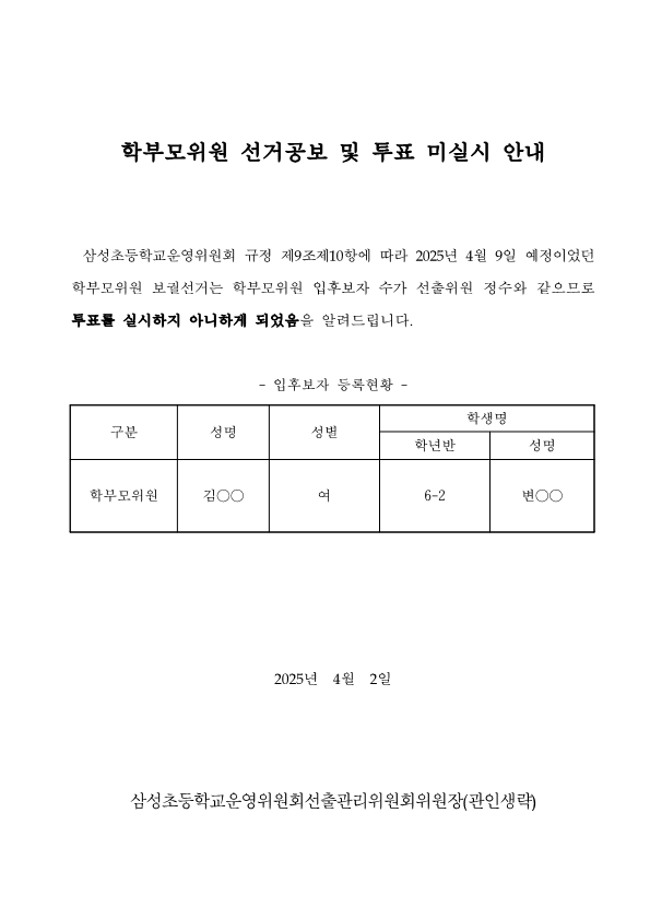 제15기 학교운영위원회 학부모위원 보궐 선거 공보 및 무투표 안내