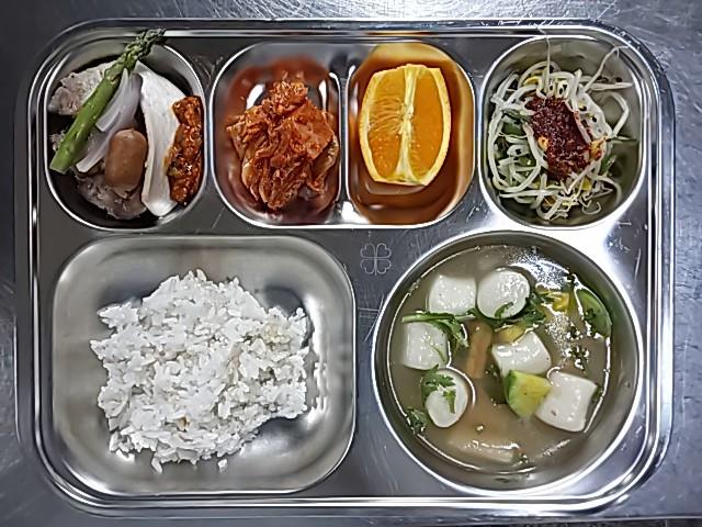 발아현미밥 물떡어묵국 (1.5.6.8.9.13.18)콩나물파채무침(자율) (5.13)햄김치볶음 (1.2.5.6.9.10.13.15.16)모듬캠핑구이 (2.5.6.10.15.16)오렌지 우유 (2)