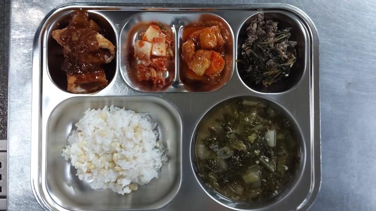 옥수수밥 콩가루배추국 (5.6)쇠고기깻잎순볶음 (5.6.16)새송이어묵볶음 (1.5.6.13)스페인돈까스*소스 (1.2.5.6.10.11.12.13.16.18)배추김치(자율) (9)우유 (2)