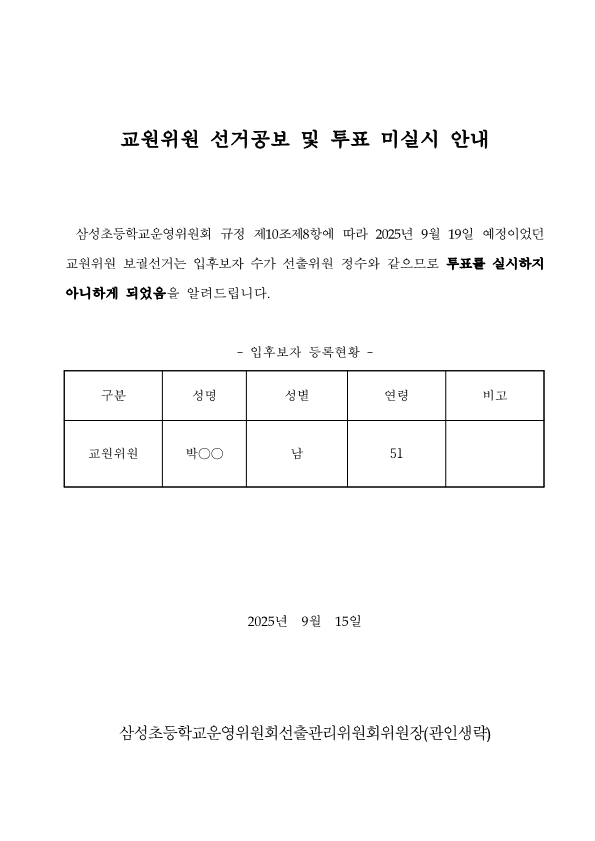 제15기 학교운영위원회 교원위원 보궐 선거 공보 및 무투표 안내