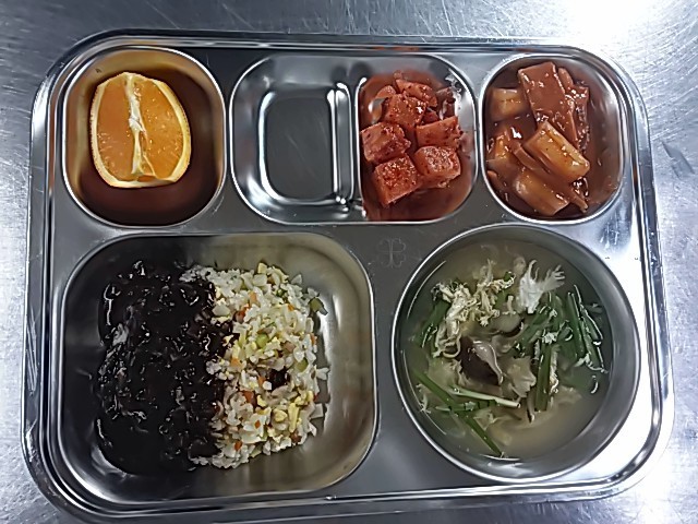 중국식볶음밥 (1.2.5.6.9.10.13.15.16.18)표고부추달걀국 (1.5.6.9)분모자 떡볶이 (1.5.6.13)깍두기(자율) (9)자장소스 (2.5.6.10.13.16)오렌지 우유 (2)