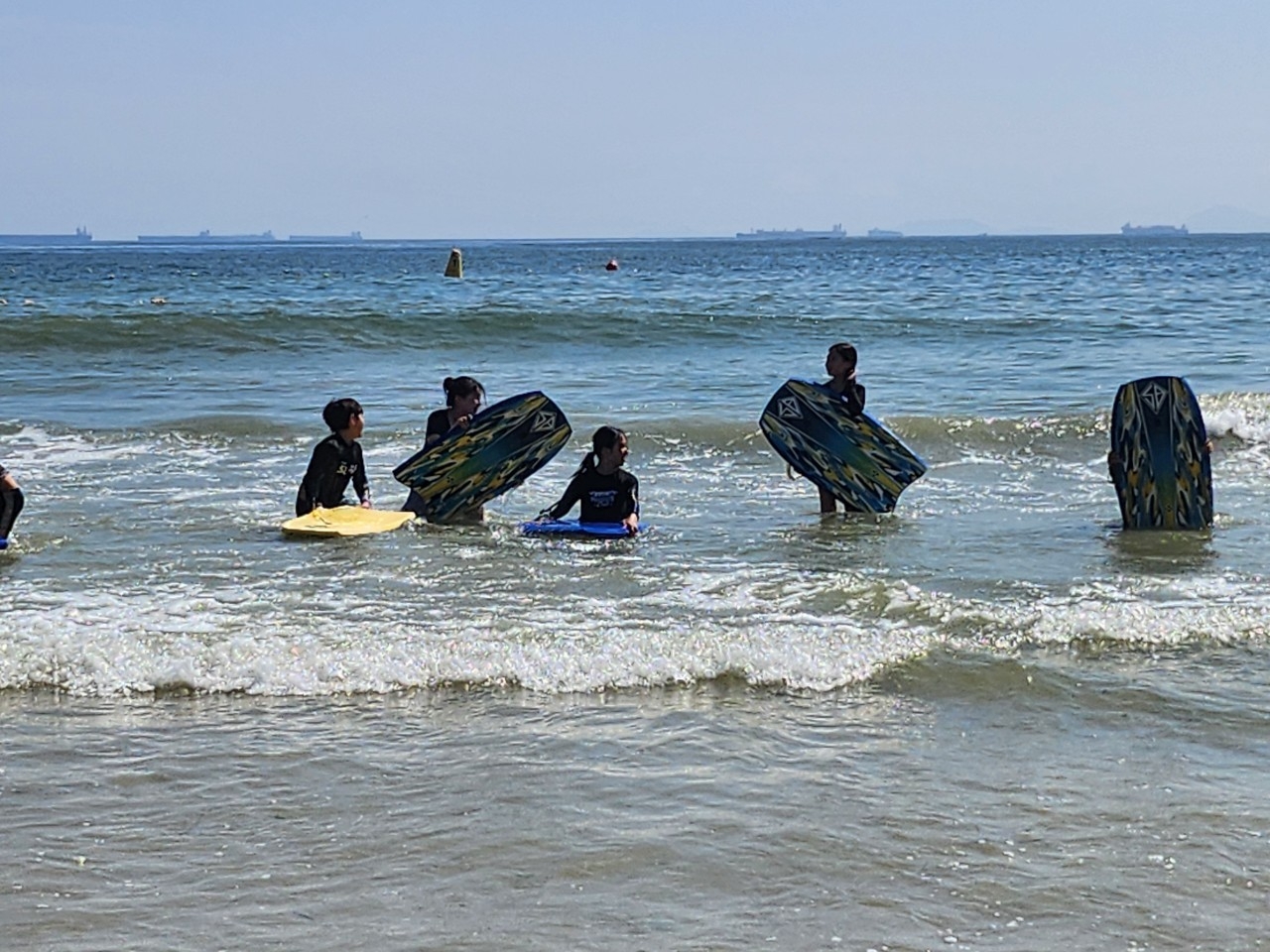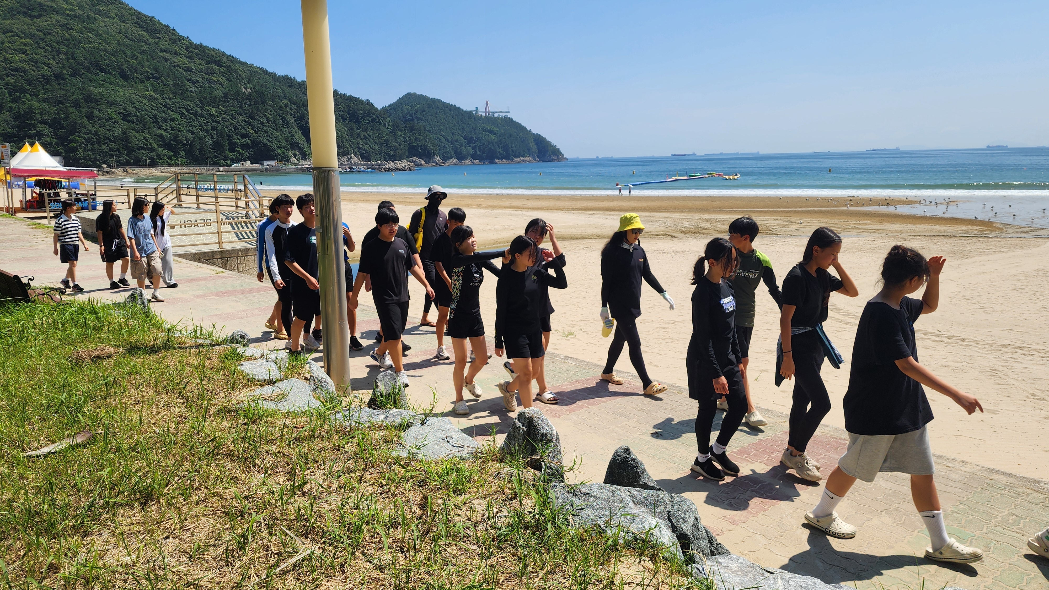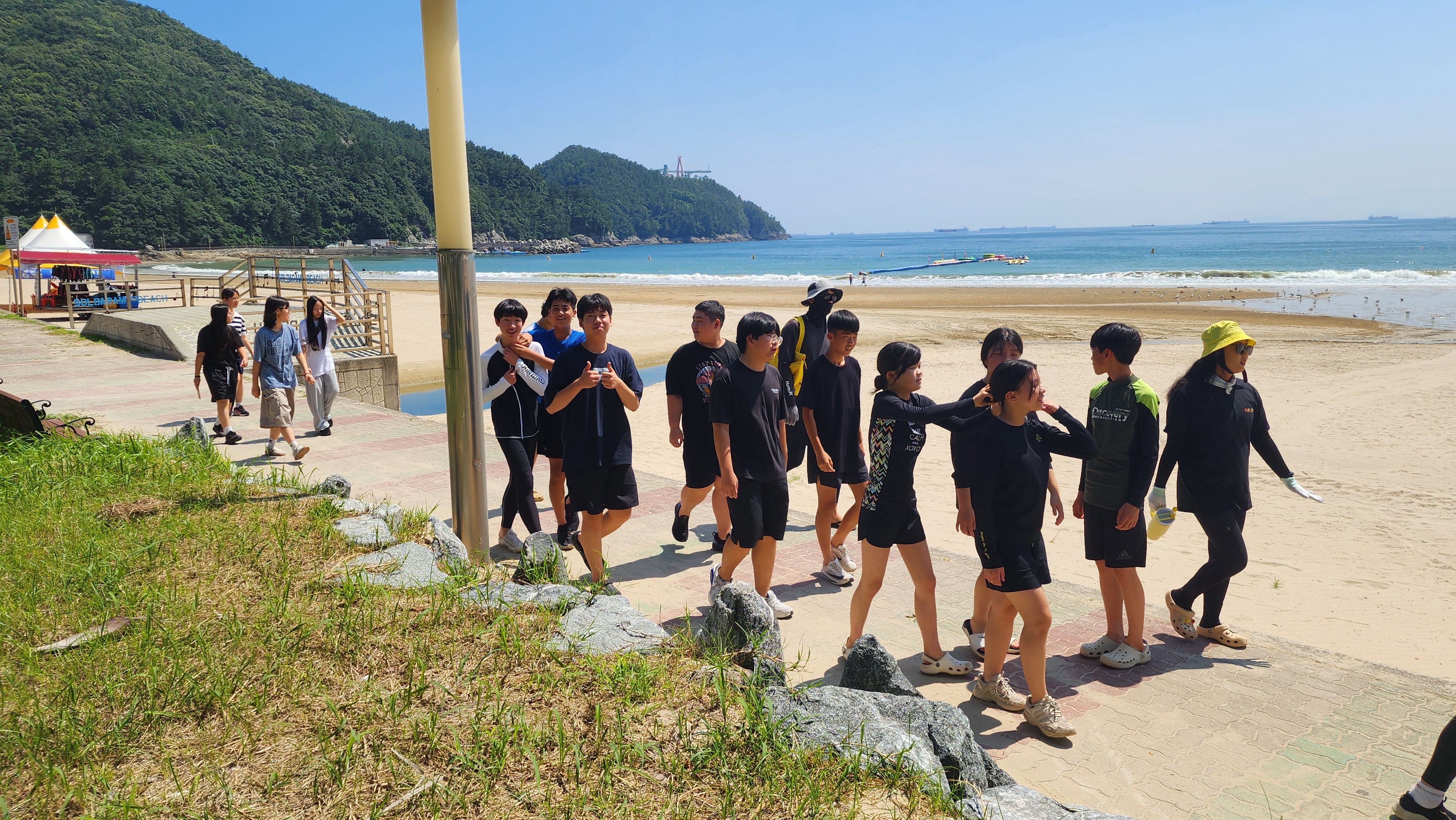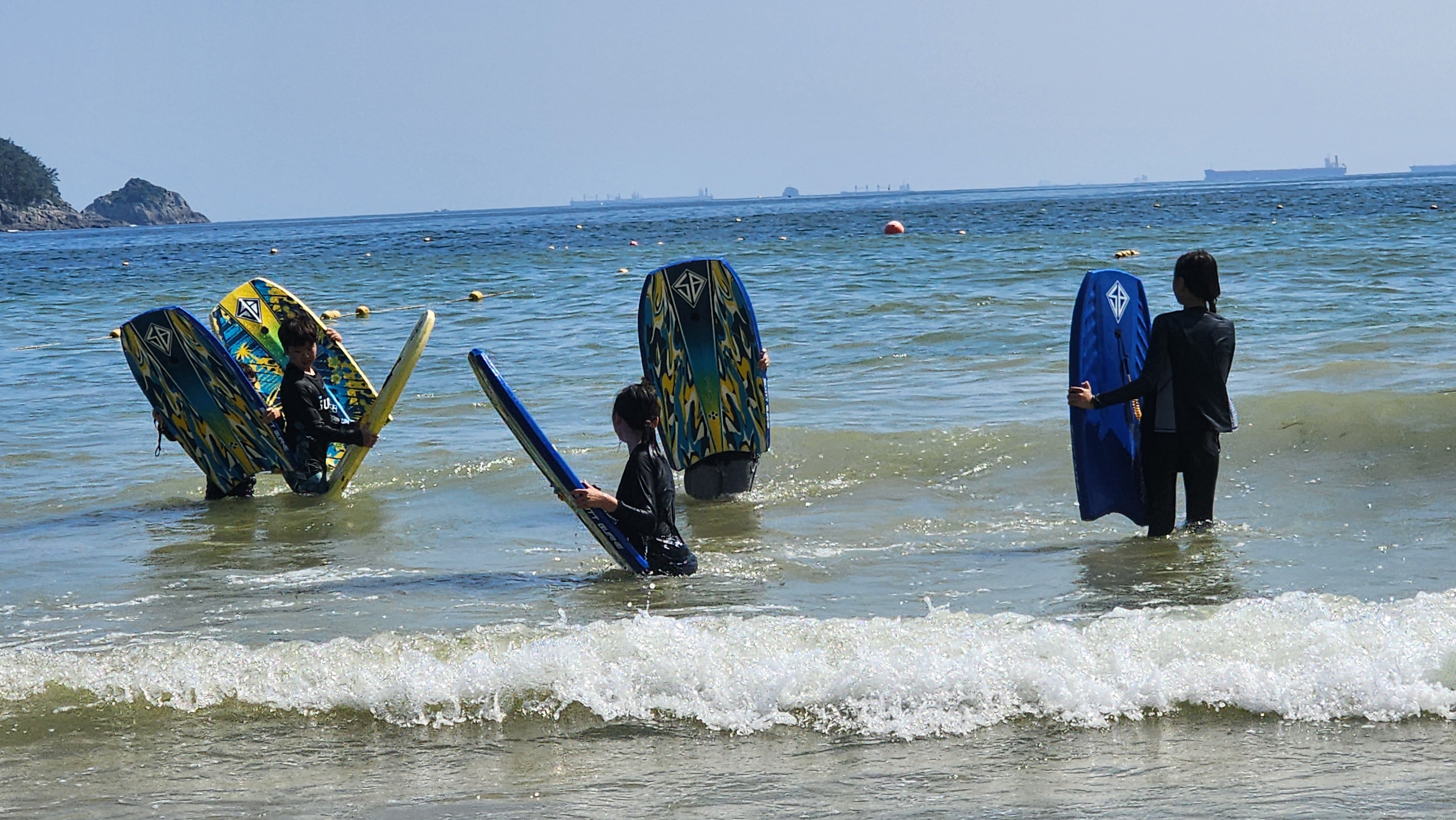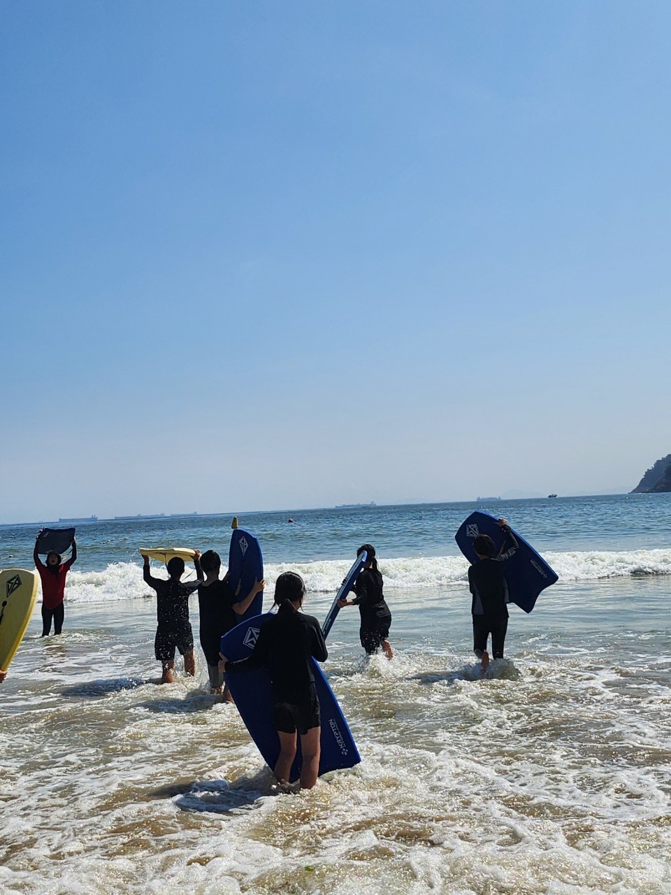 오늘 미조 송정 해수욕장에서 우리 학생들이 서핑보드 체험 활동에 참여하는 모습을 사진으로 공유드립니다. 아이들 모두 안전 장비를 착용하고, 전문 강사의 지도 아래 즐겁고 활기차게 서핑을 체험하고 있습니다.