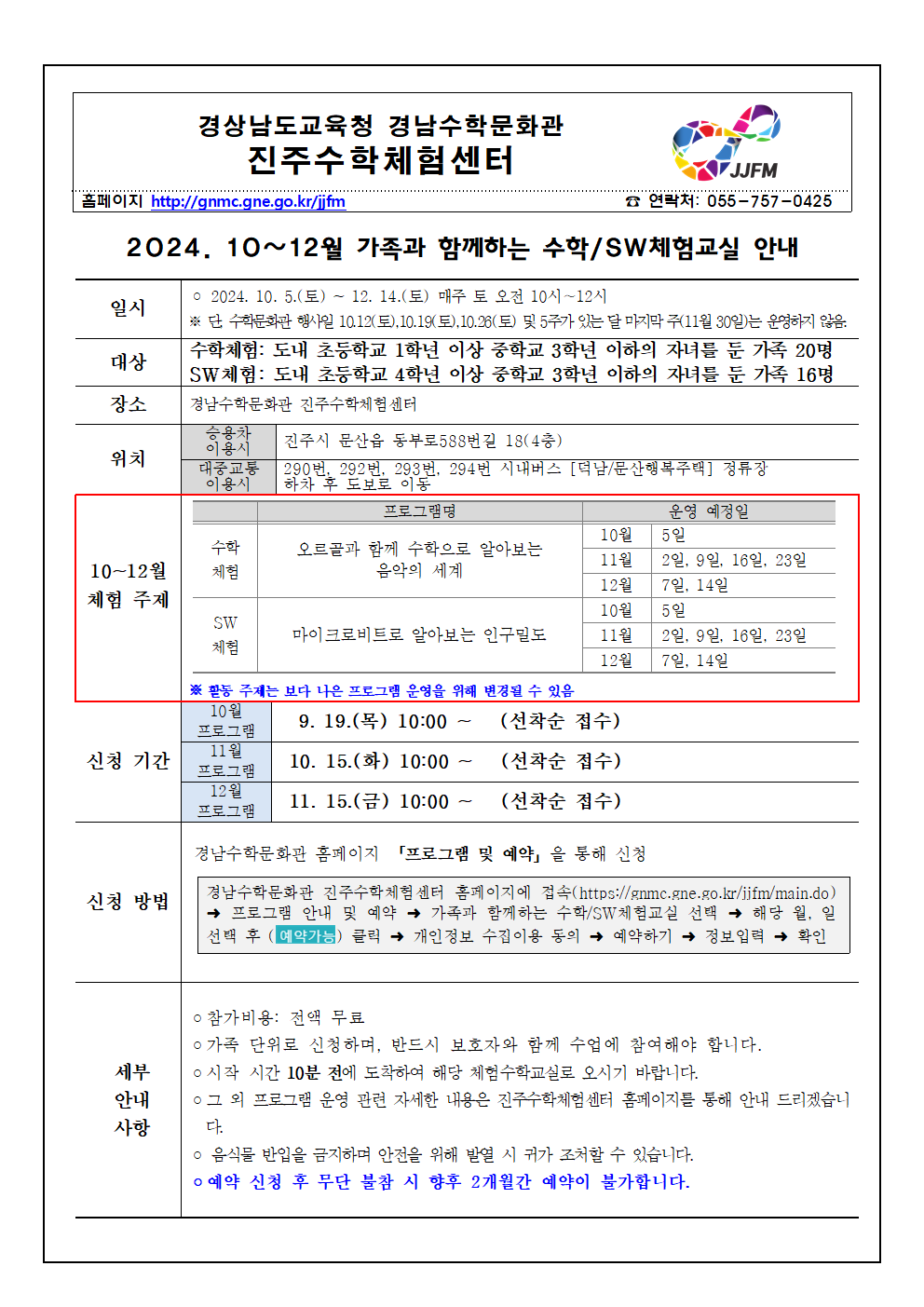 2024. 진주수학체험 센터 10~12월 가족과 함께하는 수학, SW체험 프로그램 신청 안내