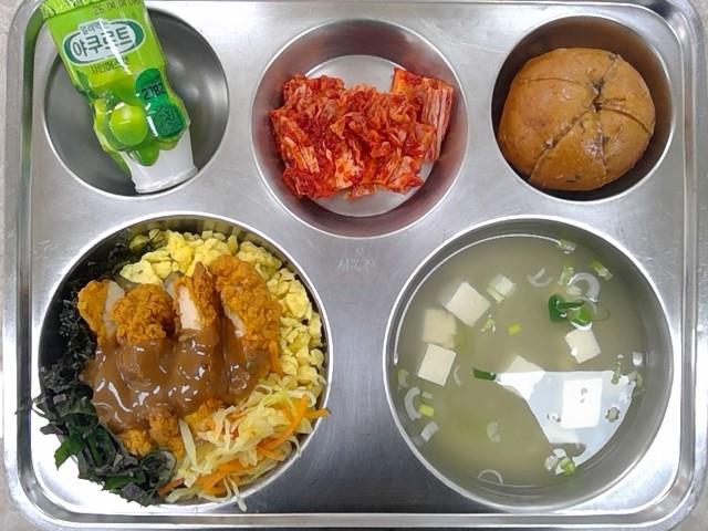 * 석식: 치킨마요덮밥, 두부새우젓국, 배추김치, 얼려먹는샤인머스캣주스, 육쪽마늘빵