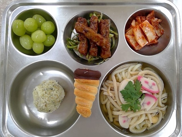 * 석식: 유부우동, 후리카케주먹밥, 스틱떡갈비와 파채무침, 배추김치, 소라빵, 씨 없는 포도