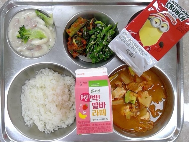 * 저녁: 쌀밥, 돈육짜글이찌개, 까르보나라쌀스파게티, 미나리나물, 오이소박이, 딸바라떼, 불닭맛김