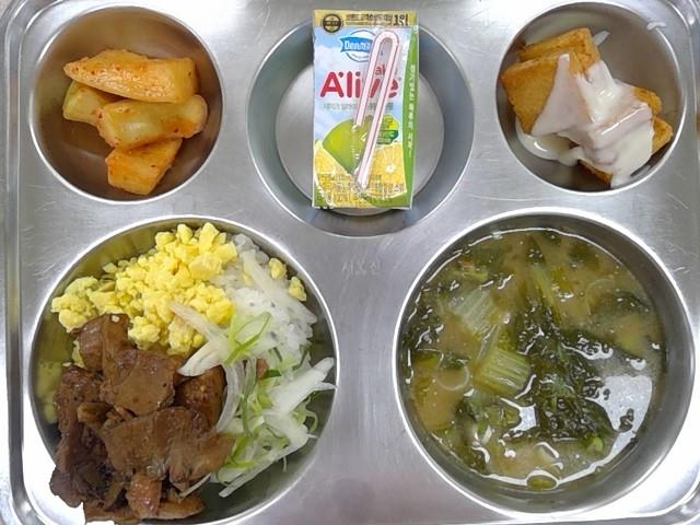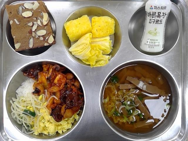 * 중식: 주꾸미덮밥&양파스크램블에그, 도토리묵채국, 백김치, 골드파인애플, 무항생제요구르트, 수제찰보리빵