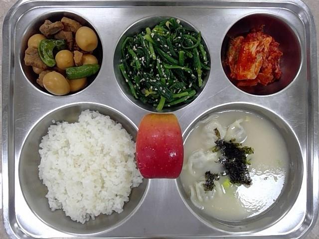 * 조식: 쌀밥, 사골떡만두국, 한돈메추리알장조림, 시금치나물, 배추김치, 사과