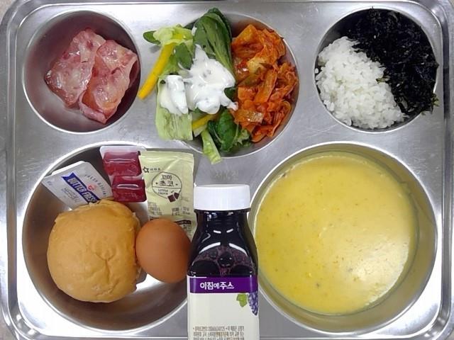 * 중식: (자)쌀밥+김자반+볶음김치, 단호박크림스프, 양상추비타민샐러드, 베이컨구이, 모닝빵+초코스프레드딸기쨈+미니버터, 삶은달걀, 포도주스