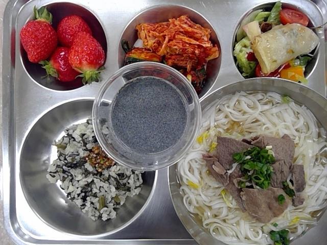 * 중식: 곤드레나물밥/양념장(자), 양지쌀국수, 짜조샐러드, 배추김치, 오이소박이, 딸기, 흑임자라떼