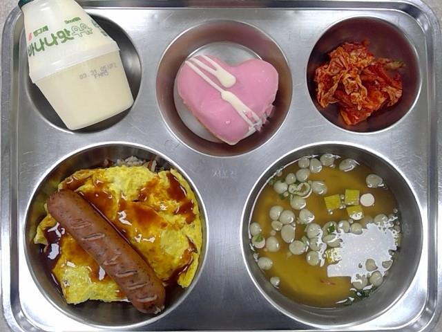 * 석식: 소시지오므라이스, 가쓰오장국, 미니도넛, 단지바나나우유, 배추김치