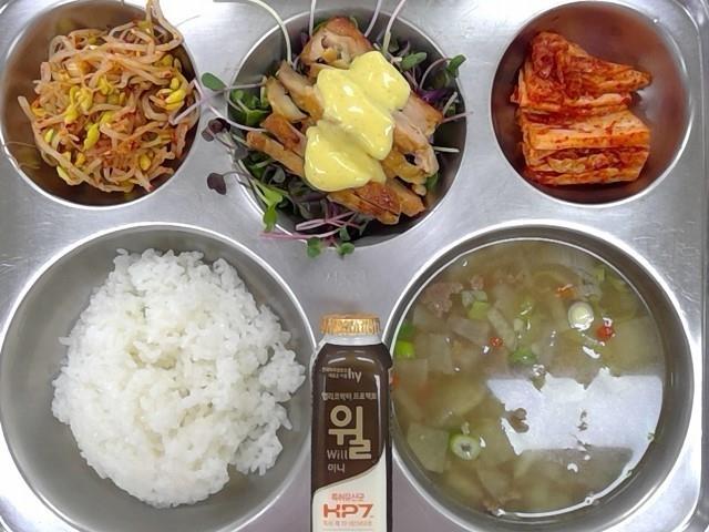 쌀밥, 쇠고기무국, 훈제닭다리살, 매운콩나물무침, 배추김치, 미니윌요구르트